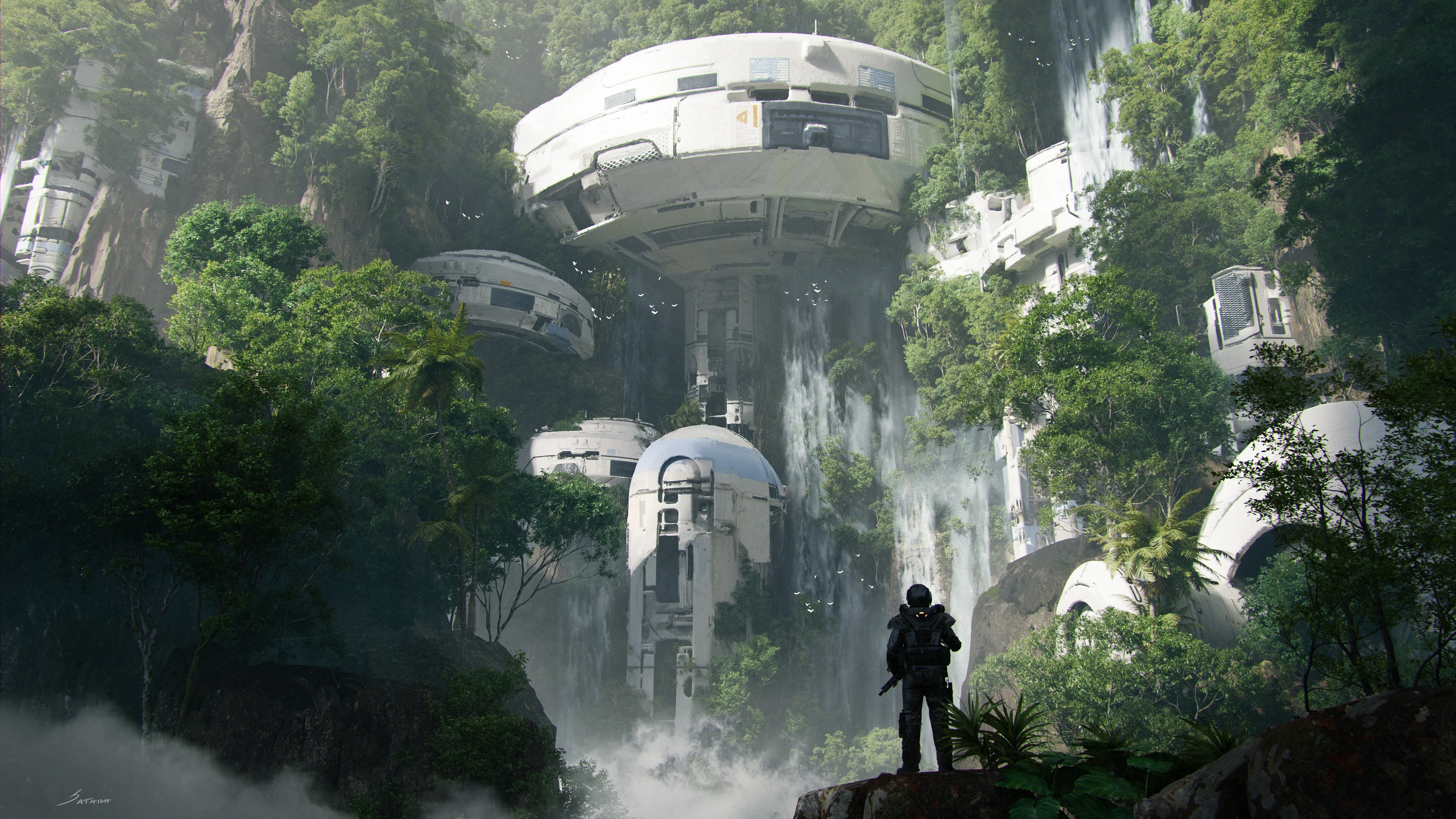奇幻艺术 瀑布 森林 树木 建筑 未来主义 科幻 水  4K壁纸