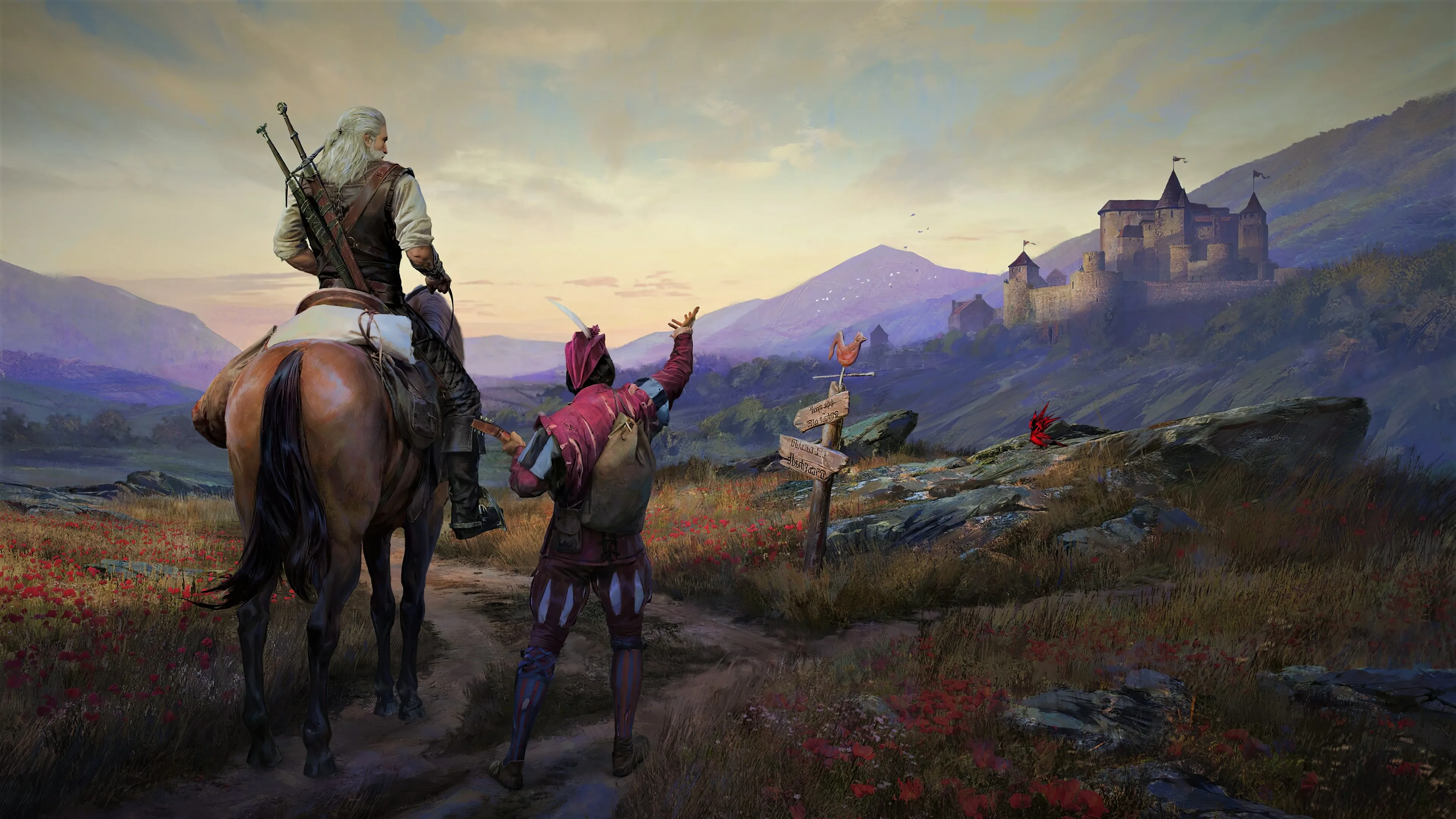 胡须 吟游诗人 蒲公英 角色 AI艺术 游戏CG 巫师 狂野狩猎 红衣主教 城堡 马 风景 路标 风向标 游戏  4K壁纸