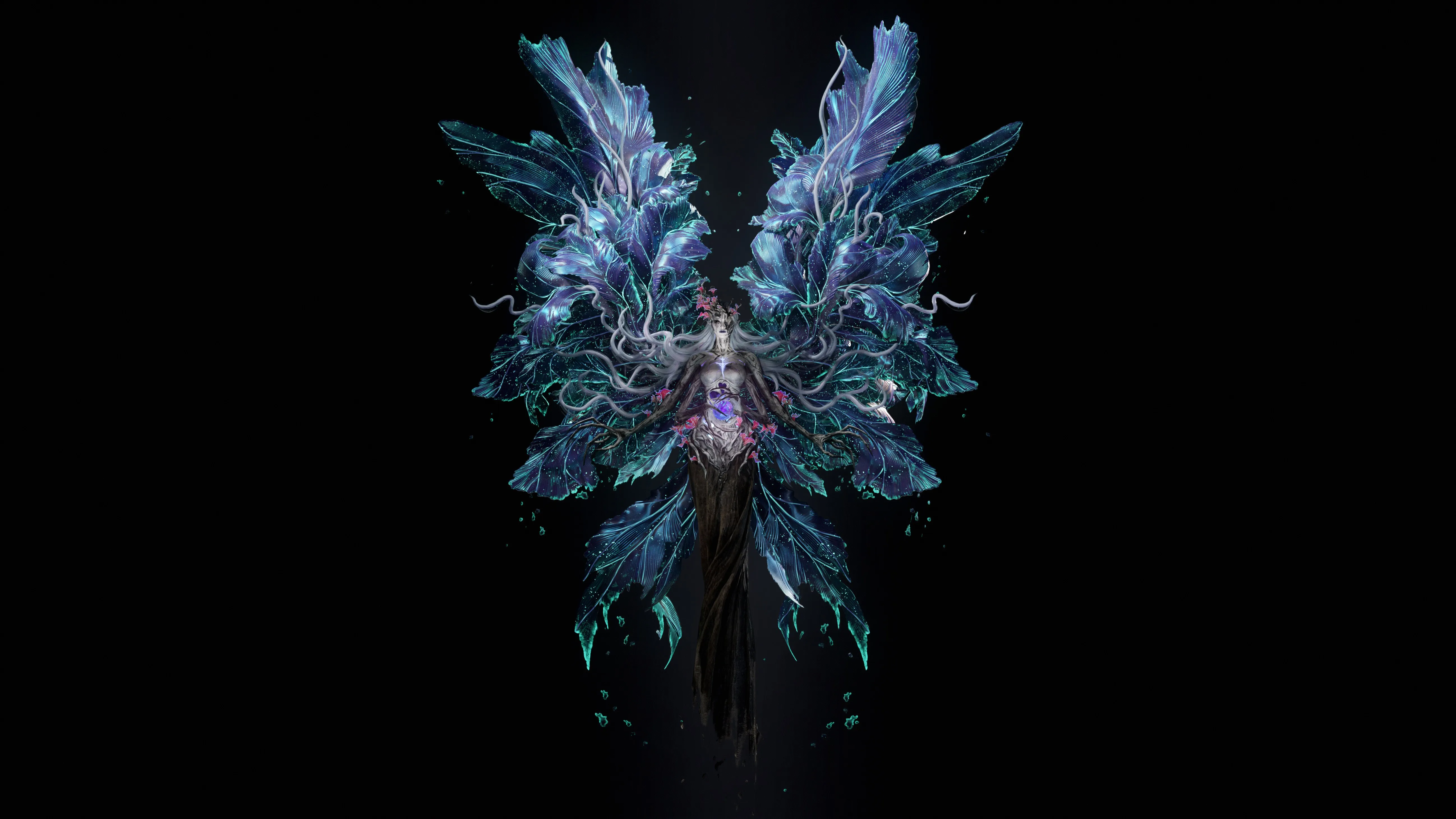 白发 全身 幻想 女孩 长发 口红 女人 黑暗背景 翅膀 简单背景 花卉 尖耳朵 黑色背景 CGI 数字艺术 4K壁纸