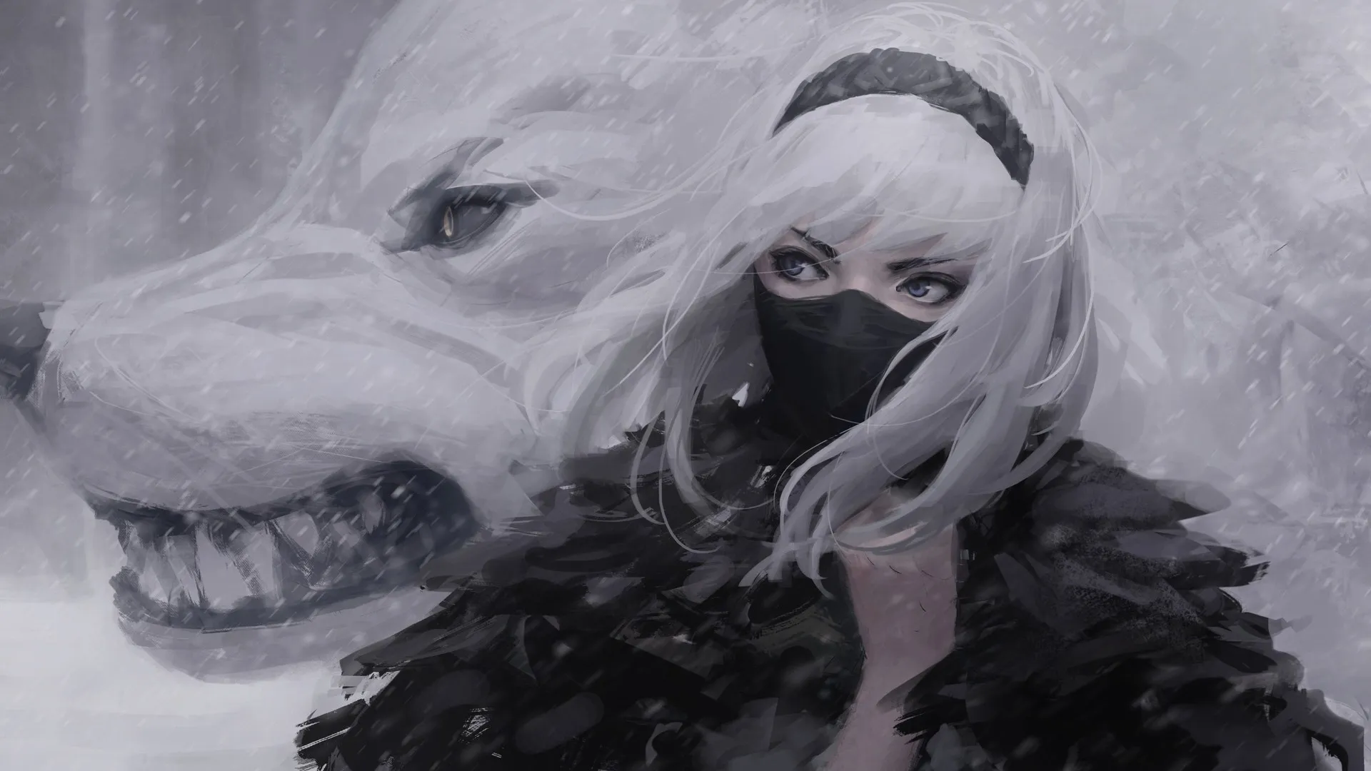 女人 奇幻女孩 白发 目光移开 原创人物 狼  电脑壁纸 4K壁纸