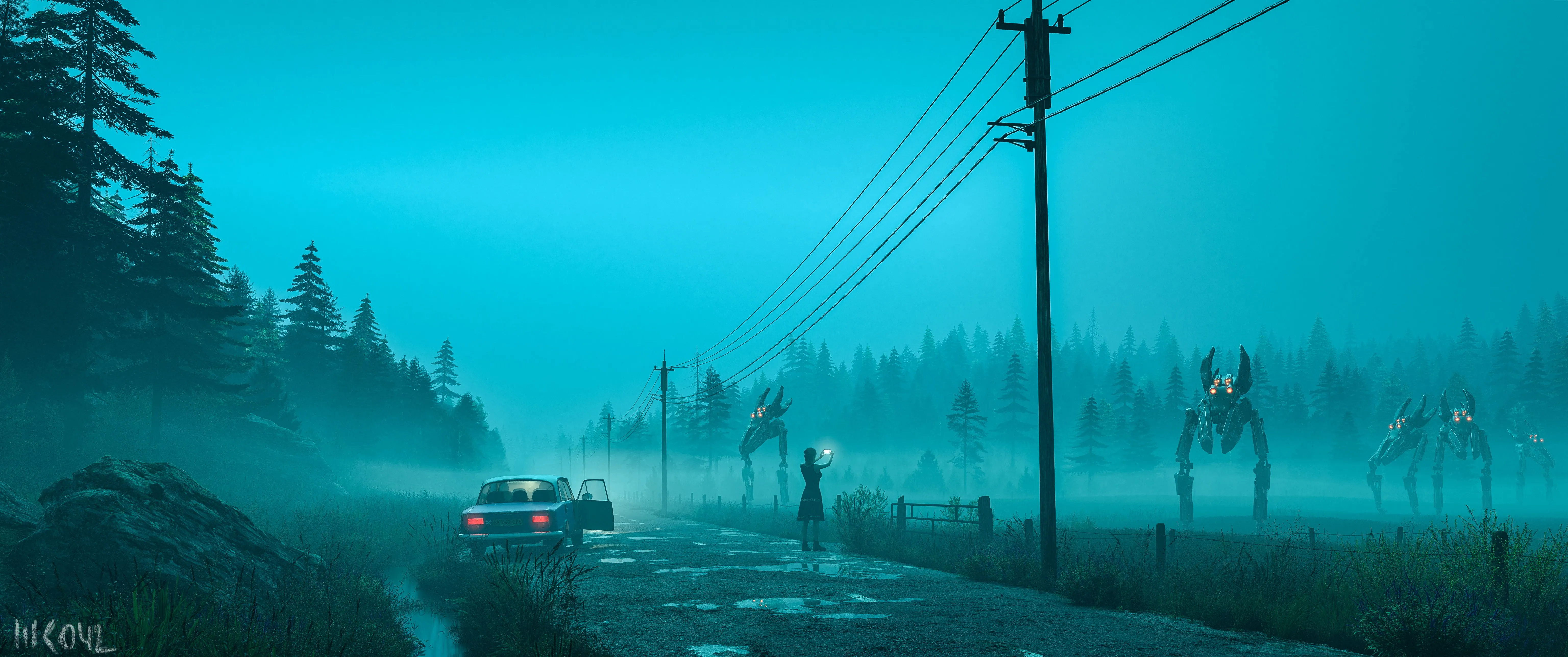 AI艺术 插图 未来主义 机器人 车辆 道路 环境 田野 夜晚 汽车 奇幻艺术 4K壁纸
