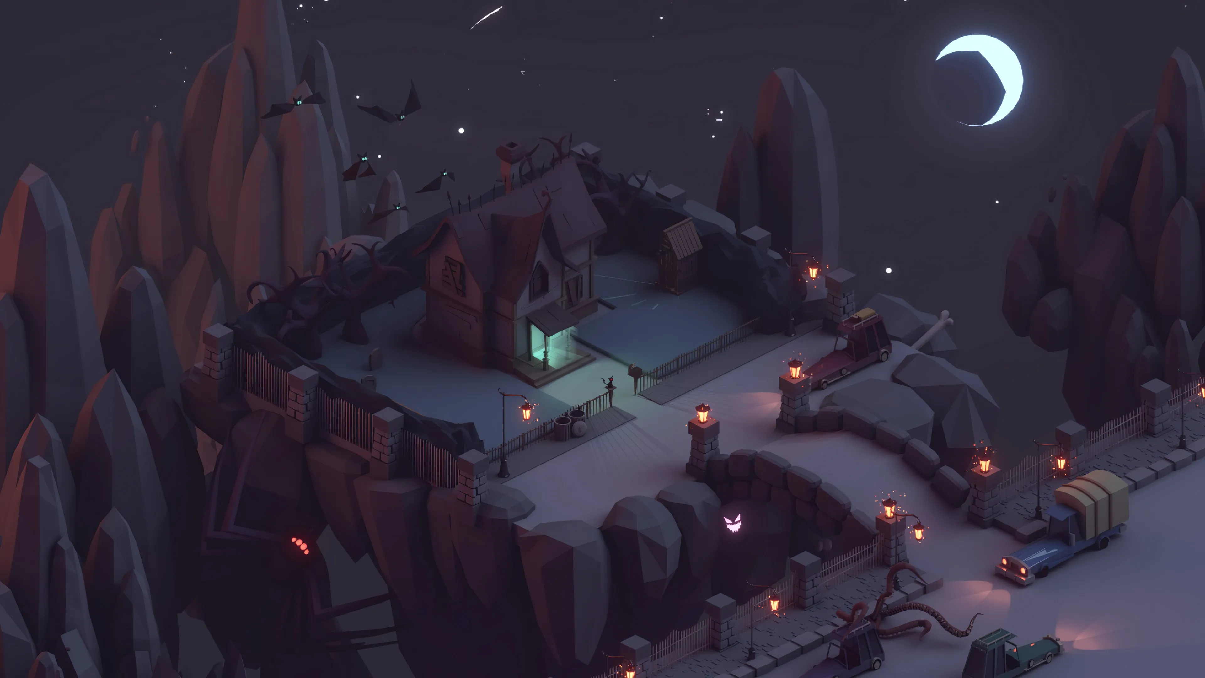 AI艺术 奇幻 艺术 房屋 幽灵 新月 蝙蝠 夜晚 汽车 触手 多边形 蜘蛛 猫 灯 万圣节 发光眼睛 月亮 4K壁纸