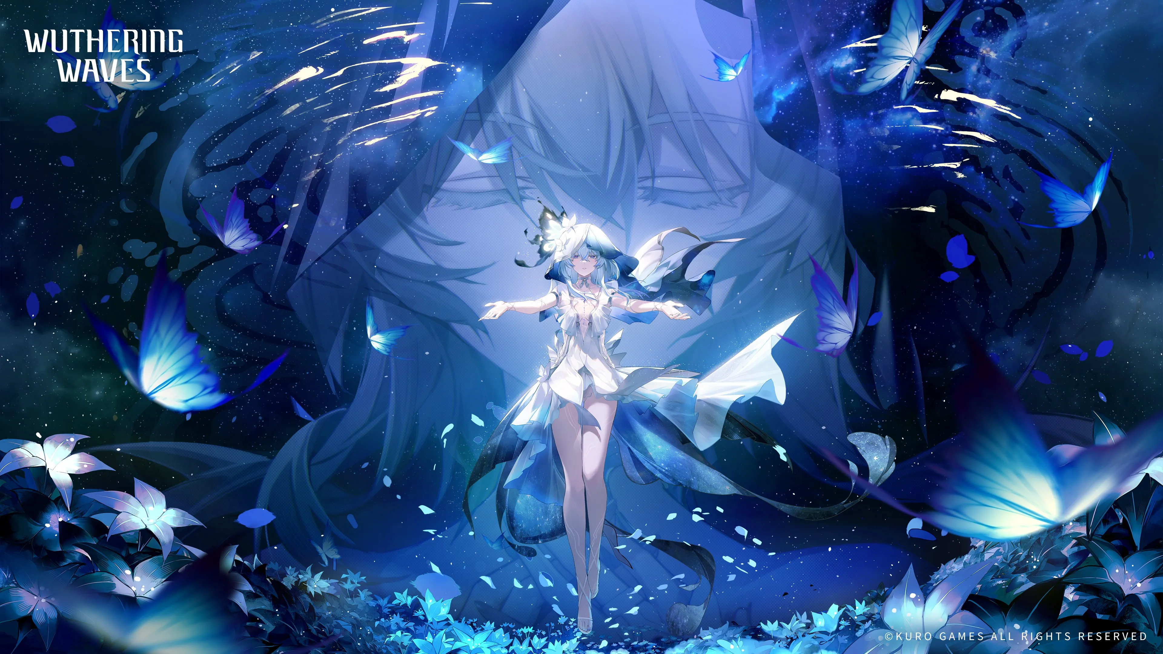 电子游戏 女孩 张开双臂 海岸守护者 电子游戏 艺术 蓝色 蝴蝶 花朵 动漫 4K壁纸