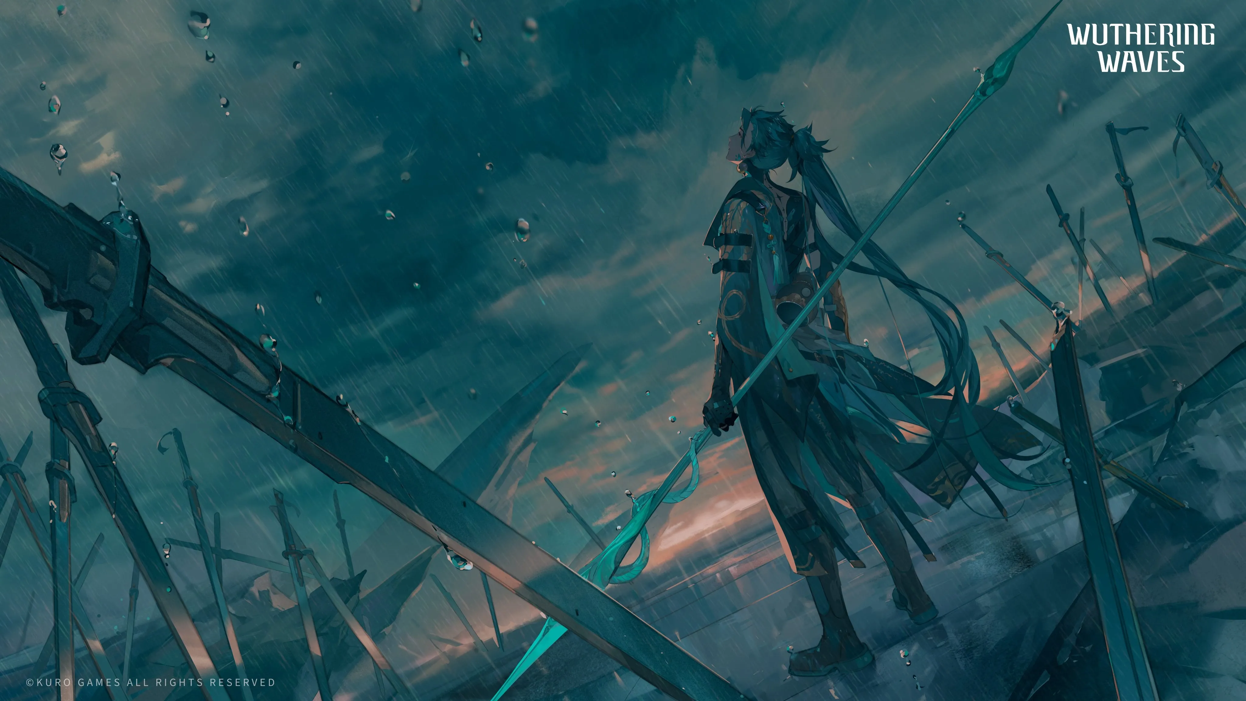 电子 游戏 角色 抬头 长发 绿发 呼啸波 极炎 长矛 下雨 长剑 战斗 阴天 4K壁纸