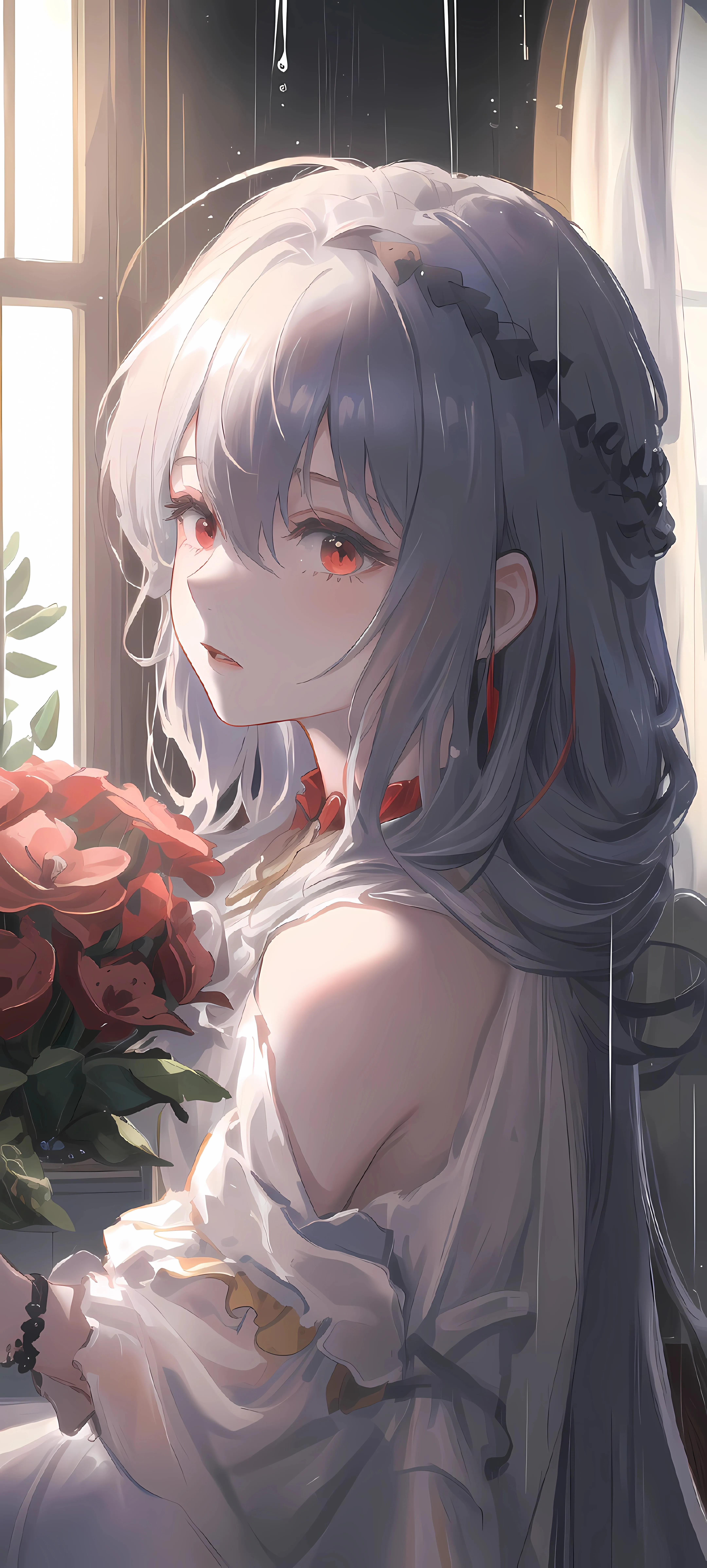 红眼睛 长发 动漫 动漫女孩 鲜花 灰发 艺术 手机壁纸 4K壁纸