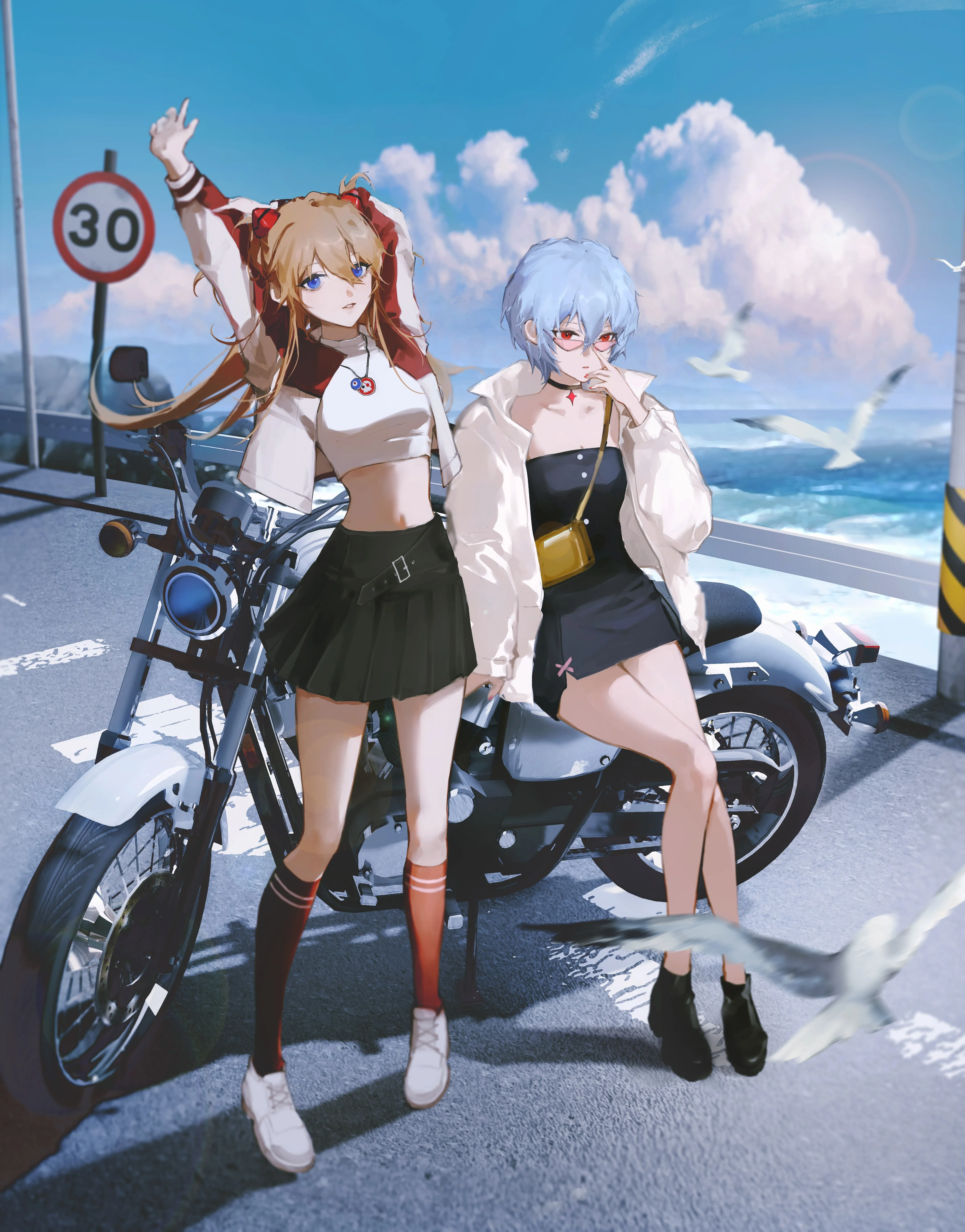 动漫 动漫女孩 明日香 绫波丽 新世纪福音战士 摩托车 机车 眼镜 袜子 天空 户外 裙子 连衣裙 手机壁纸 4K壁纸