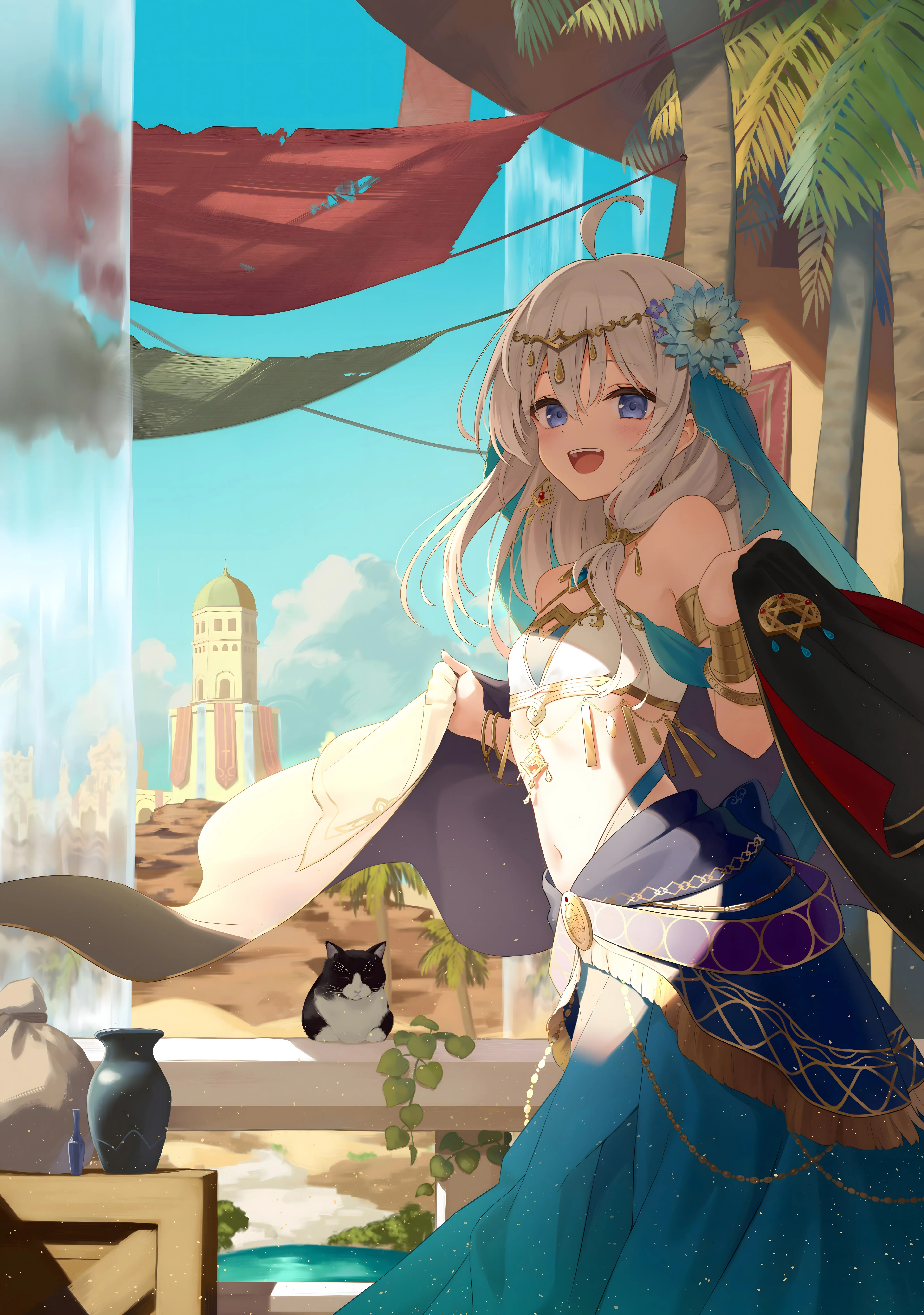 白发 蓝眼睛 灰色头发 动漫 女孩 耳环 云 天空 猫 瀑布 水 花瓶 阳光 棕榈树 手机壁纸 4K壁纸