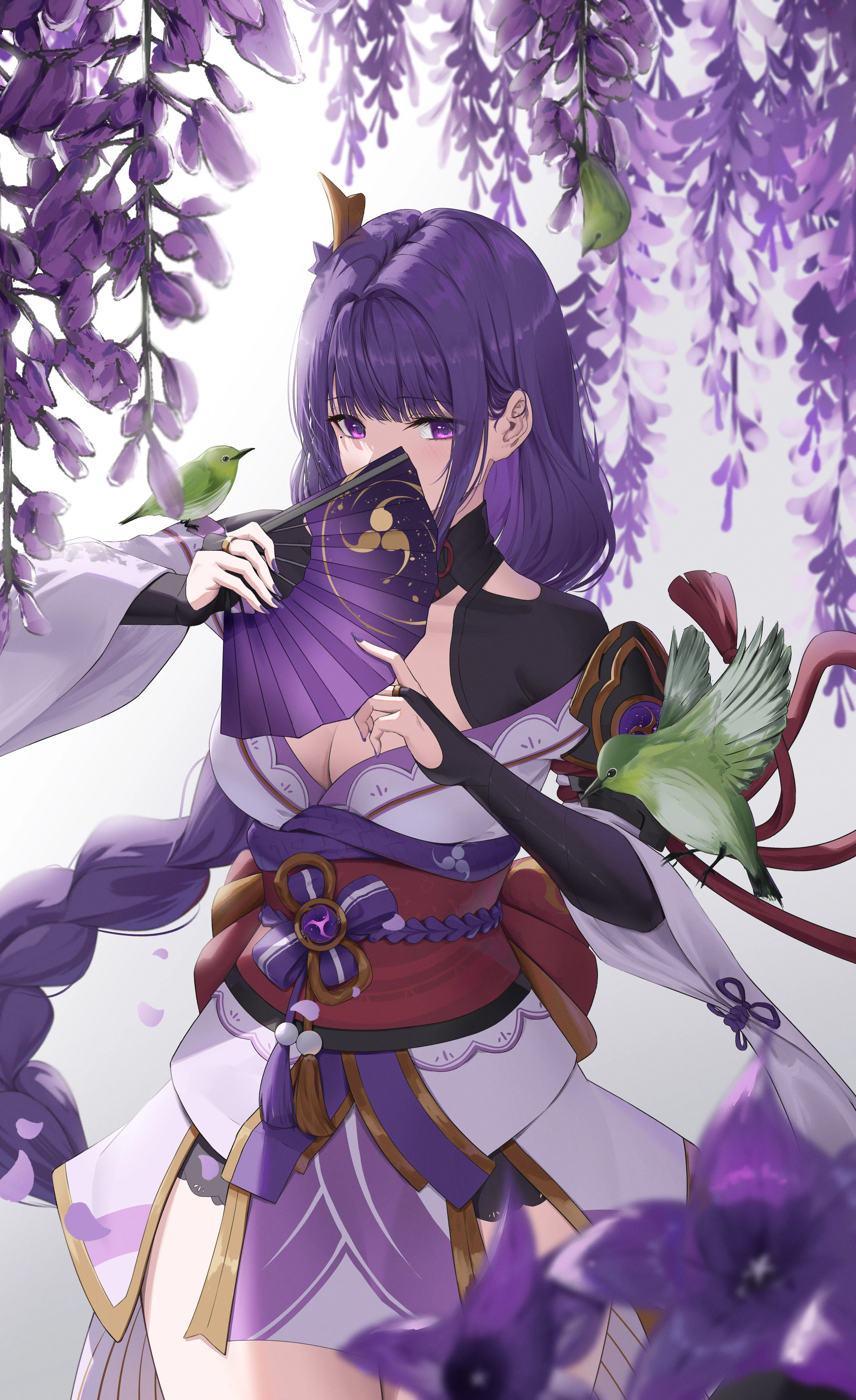 鼹鼠 痣 辫子 长发 紫色头发 原神 动漫 女孩 扇子 花 鸟 动物 花瓣 紫色眼睛 手机壁纸 4K壁纸