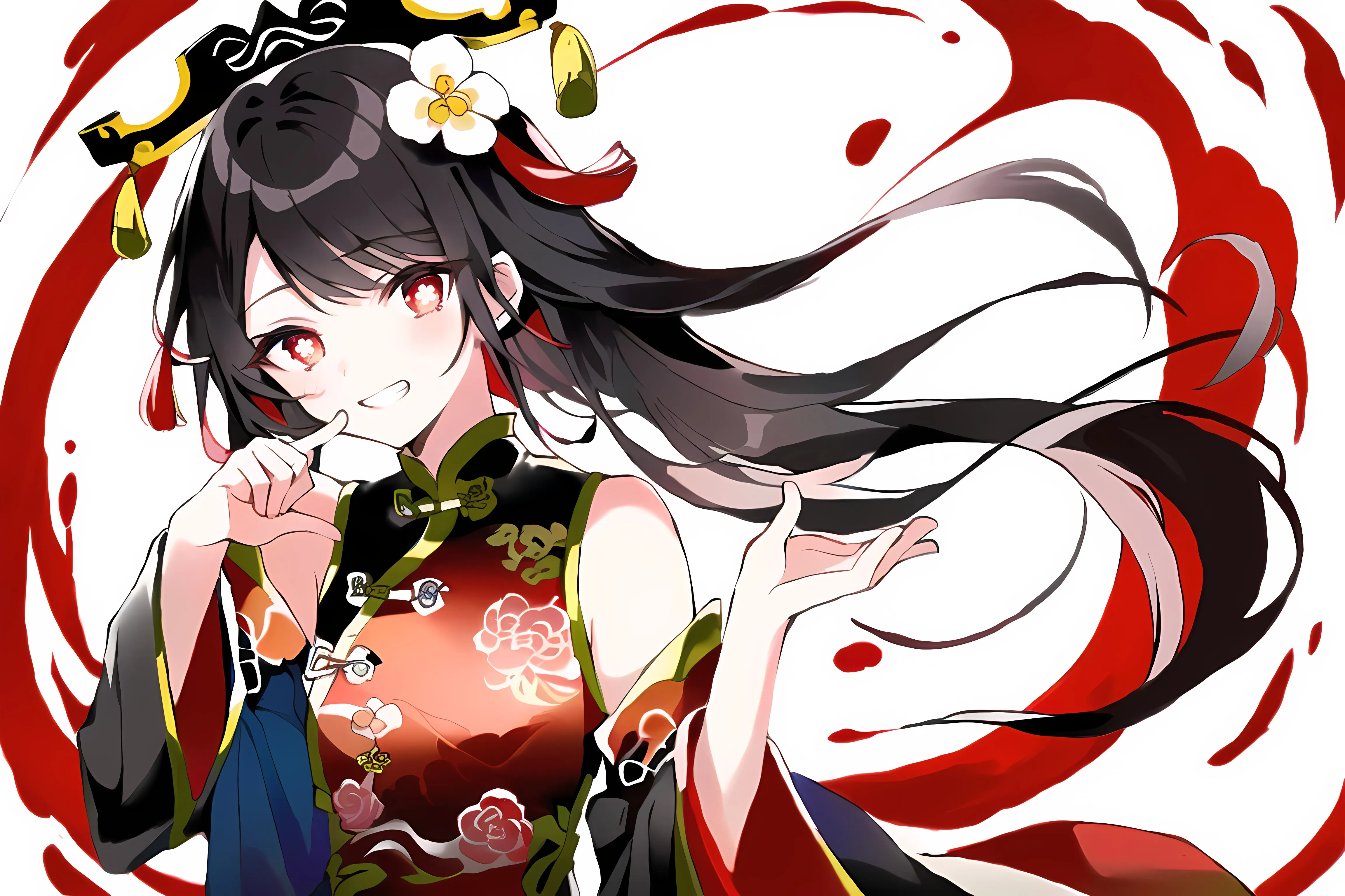 胡桃 原神 红眼睛 动漫女孩 黑发 中国服饰 头发 花  电脑壁纸 4K壁纸