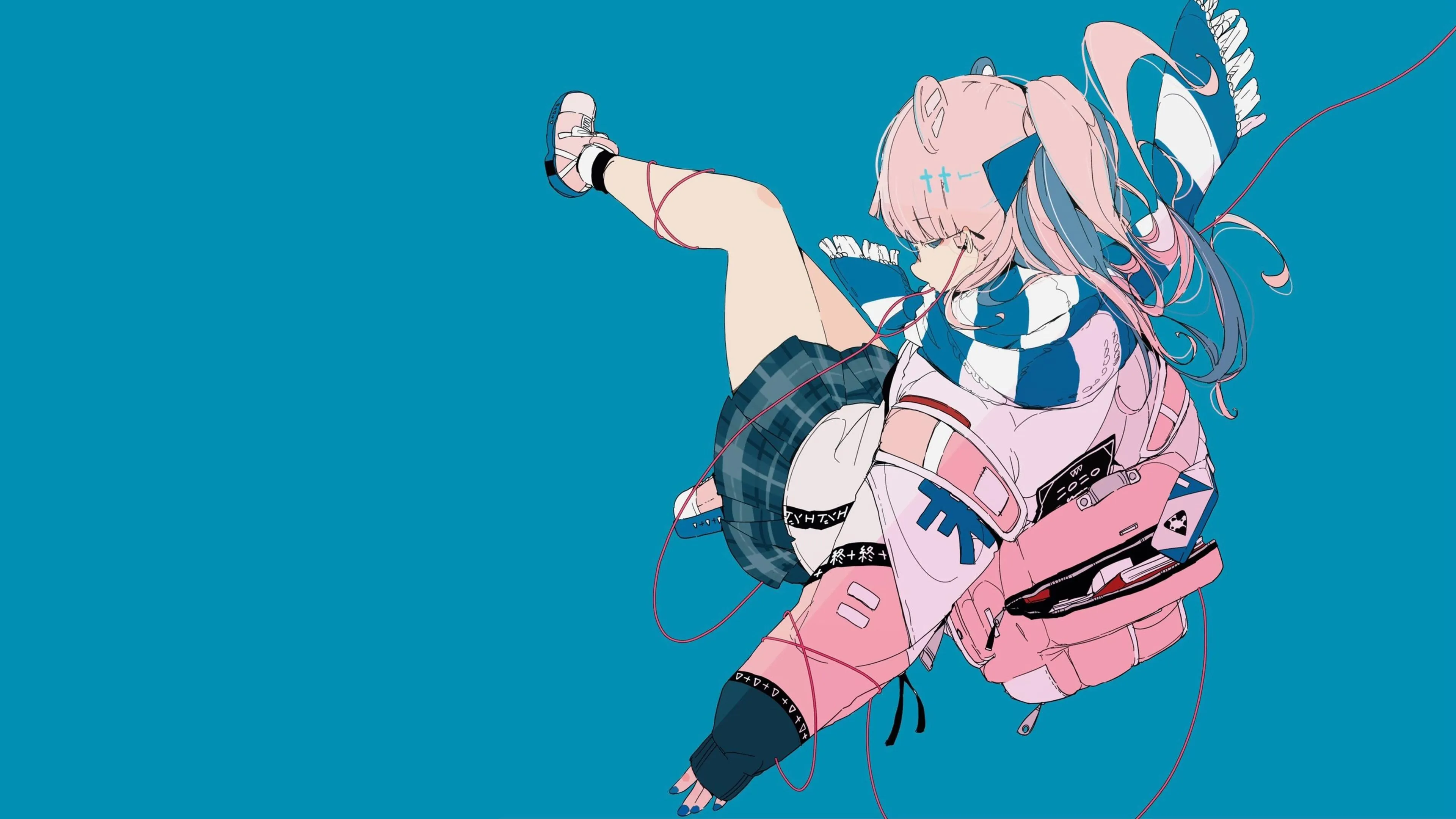 女学生 动漫女孩 背包 极简主义 蓝色背景 围巾 简单背景 校服 头发  电脑壁纸 4K壁纸