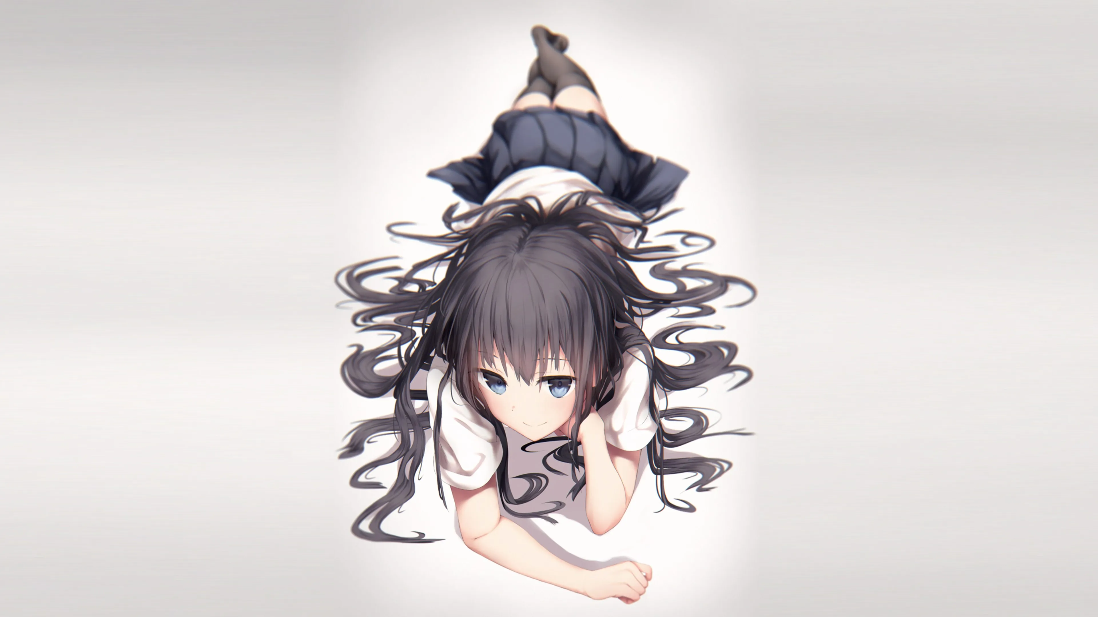 原创人物 黑发 蓝眼睛 微笑 躺在前面 动漫 动漫女孩  4K壁纸