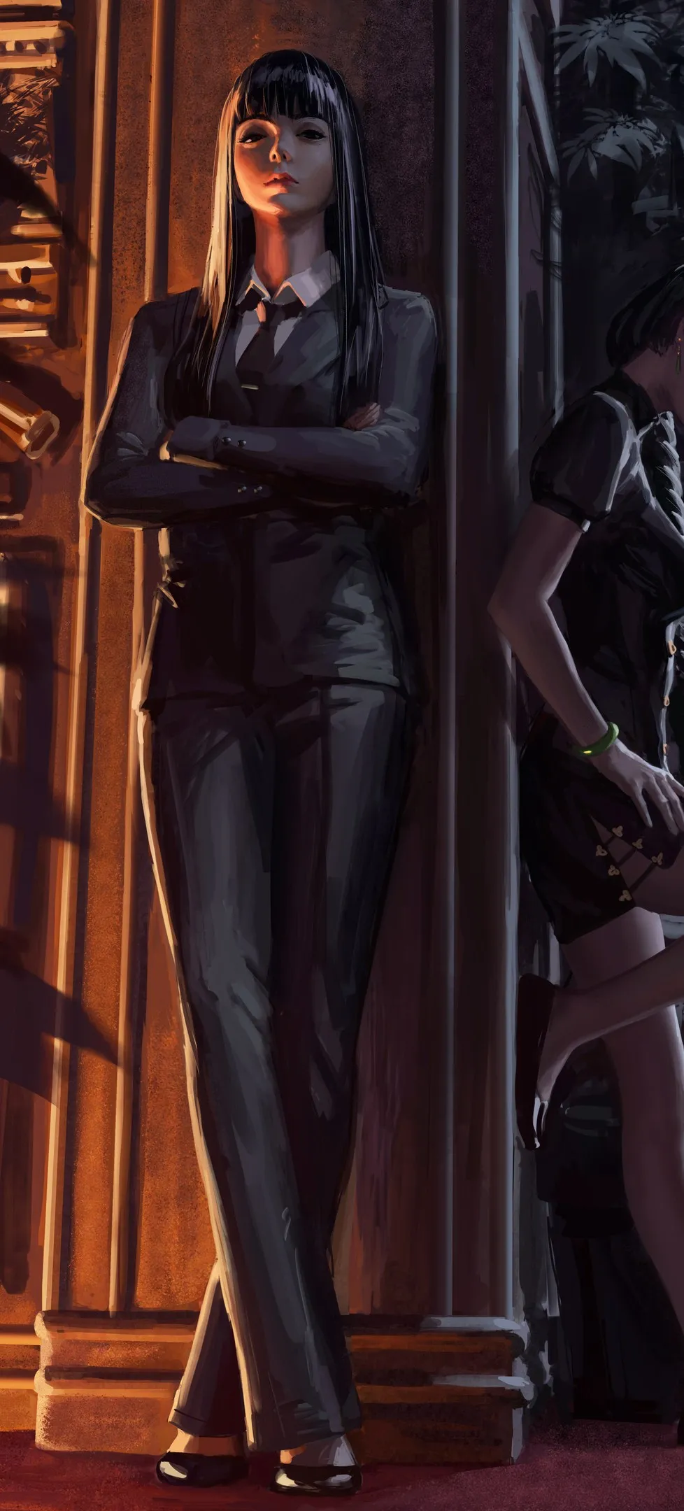 女人 交叉双腿 原创人物 西装 旗袍 黑发 黑色服装 概念艺术 素描 4壁纸