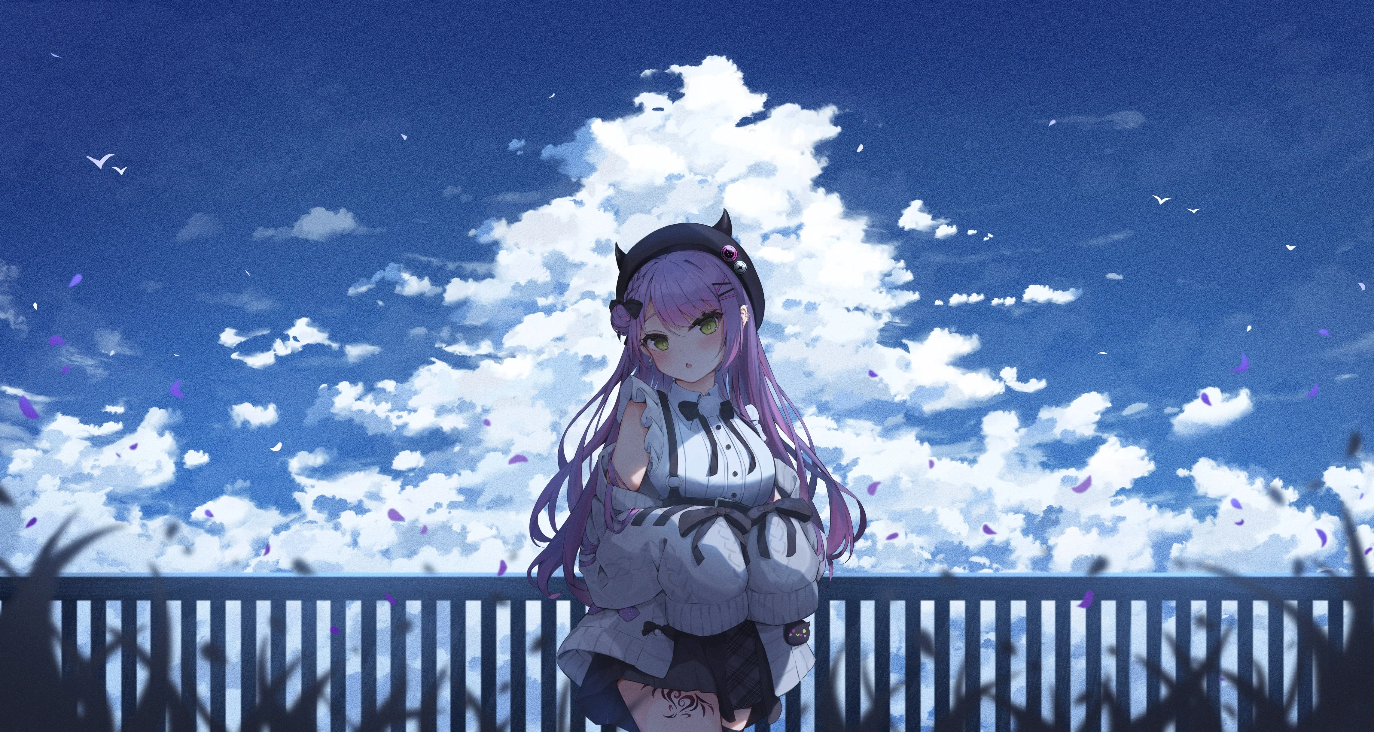 户外 绿色眼睛 紫色头发 长发 墨水女孩 妇女 帽子 动漫 云 女孩 天空 裙子 虚拟 4K壁纸