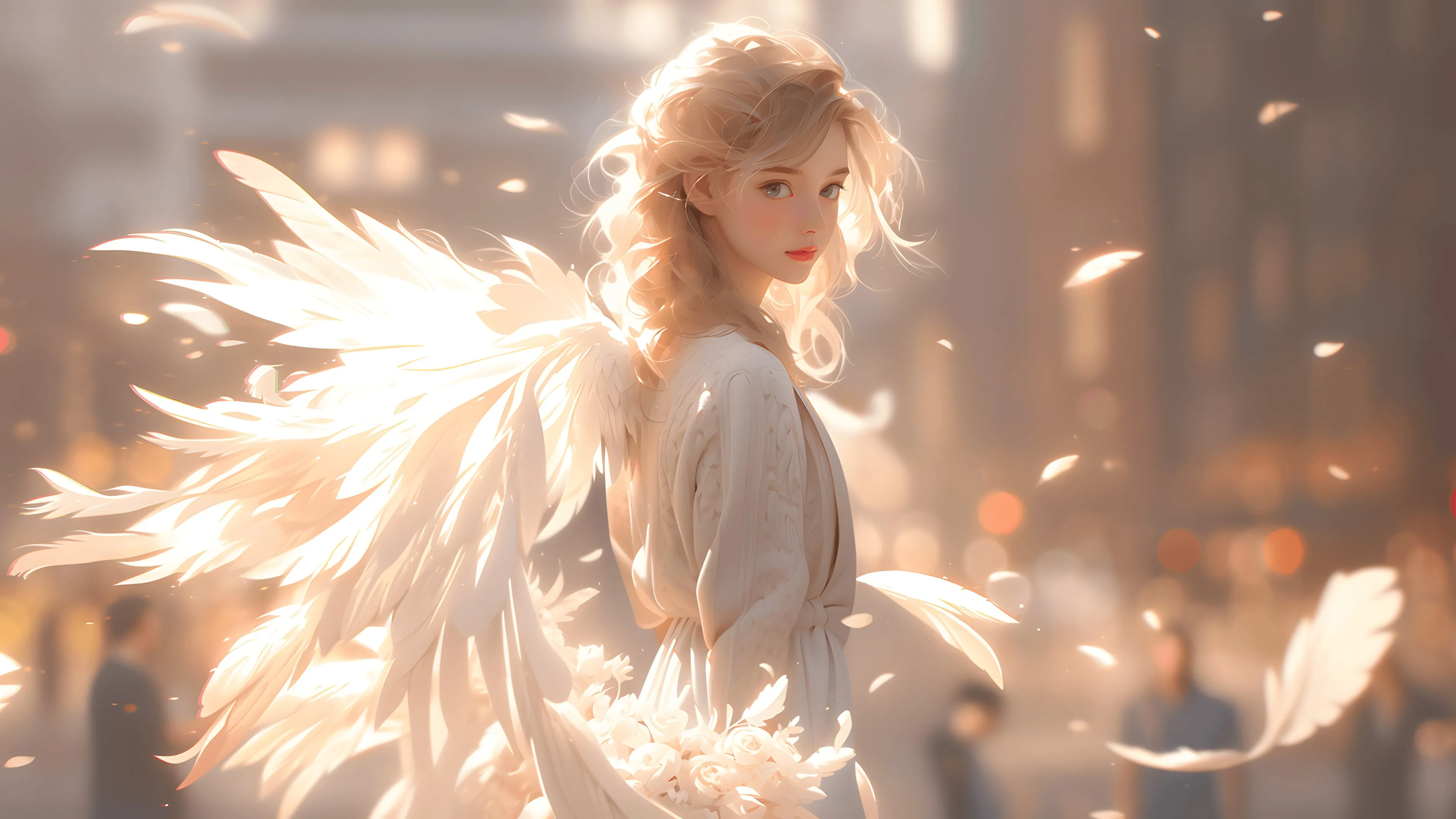 女人 金发 碧眼 艺术 翅膀 AI艺术 羽毛 4K壁纸