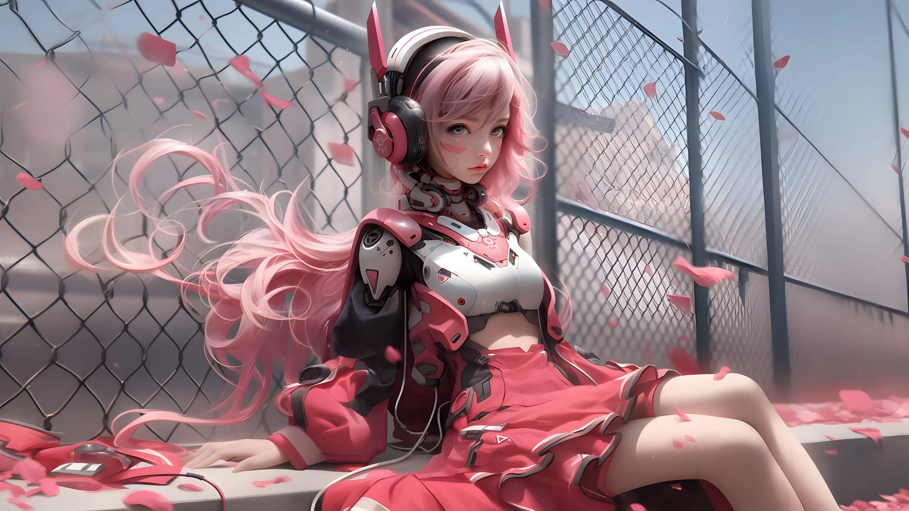 女人 长发 艺术 AI艺术 花瓣 栅栏 耳机  电脑壁纸 4K壁纸