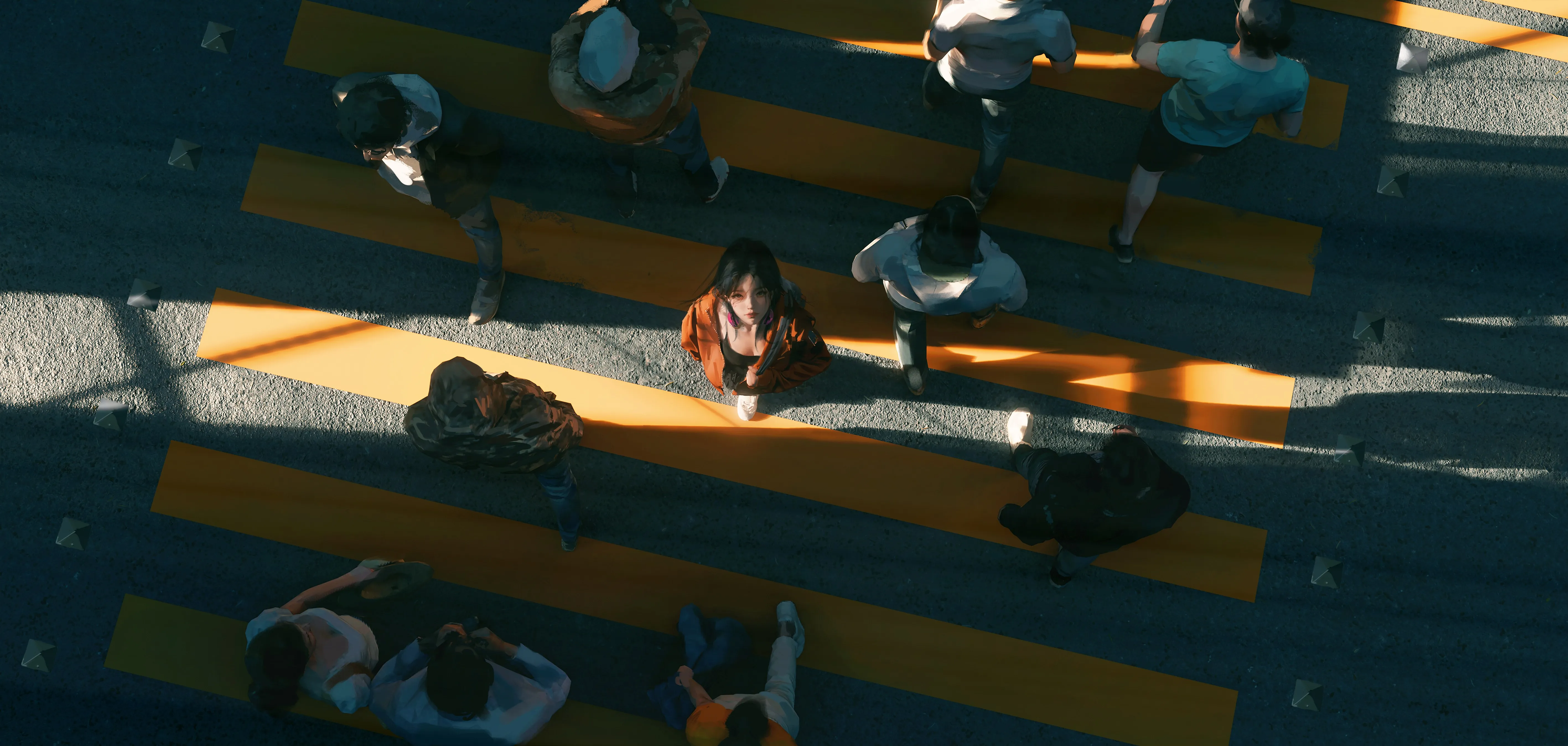 WLOP 女人 看观众 黑发 长发 数字艺术 艺术品 插图 数字绘画 街道 人行横道 鸟瞰图 阳光  电脑壁纸 4K壁纸