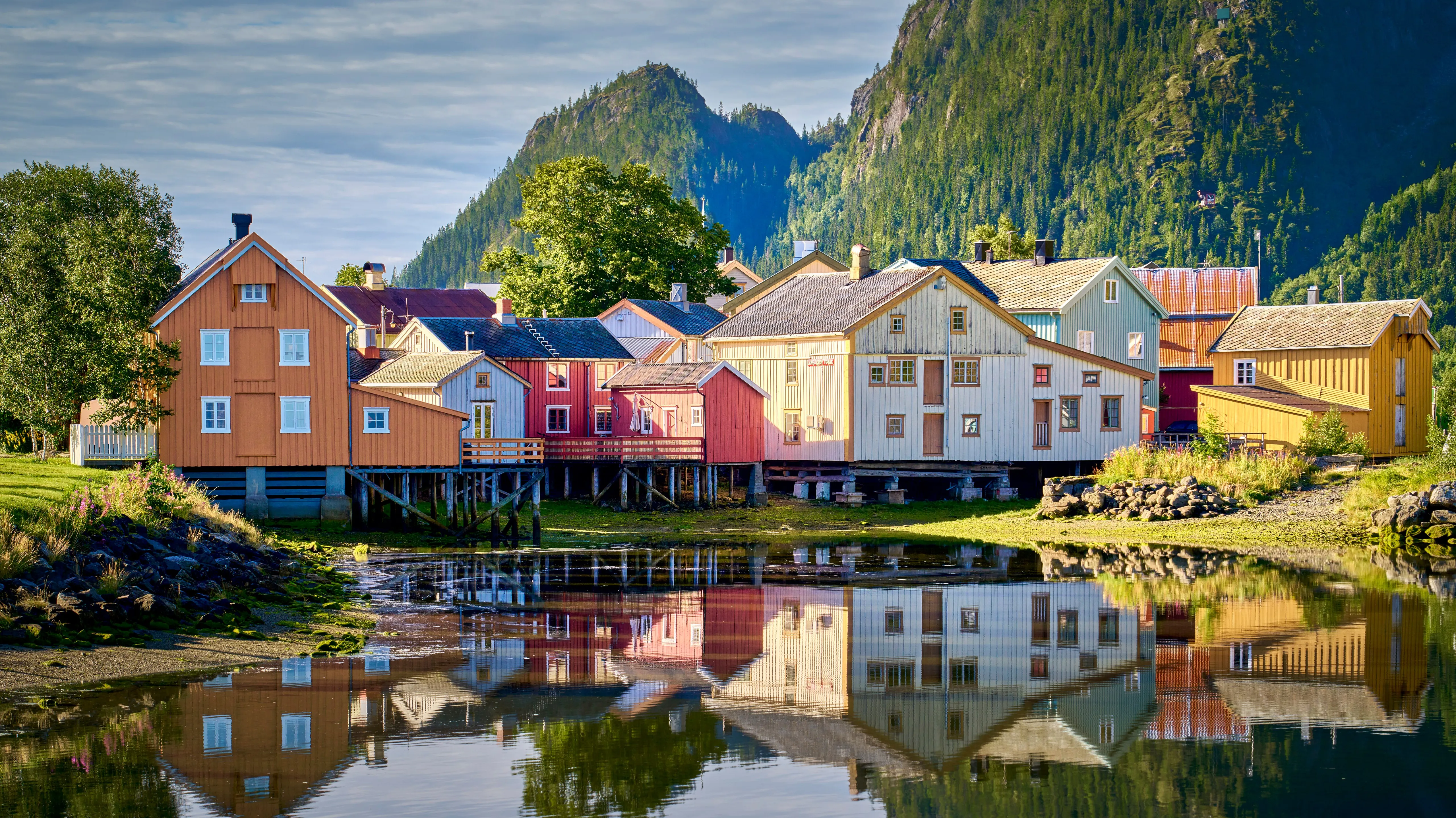 自然 风景 房屋 村庄 岩石 草地 植物 水面 山脉 云朵 倒影 天空 河流 建筑 树木 4K壁纸