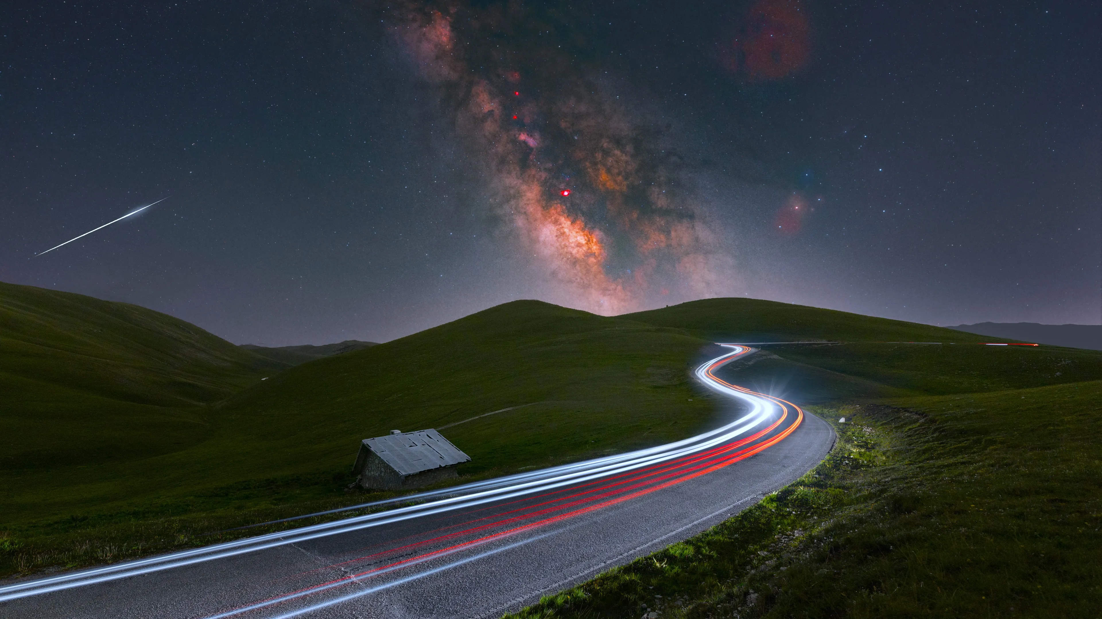 自然 风景 草 道路 沥青 灯光 岩石 星星 夜晚 房屋 山丘 银河 4K壁纸