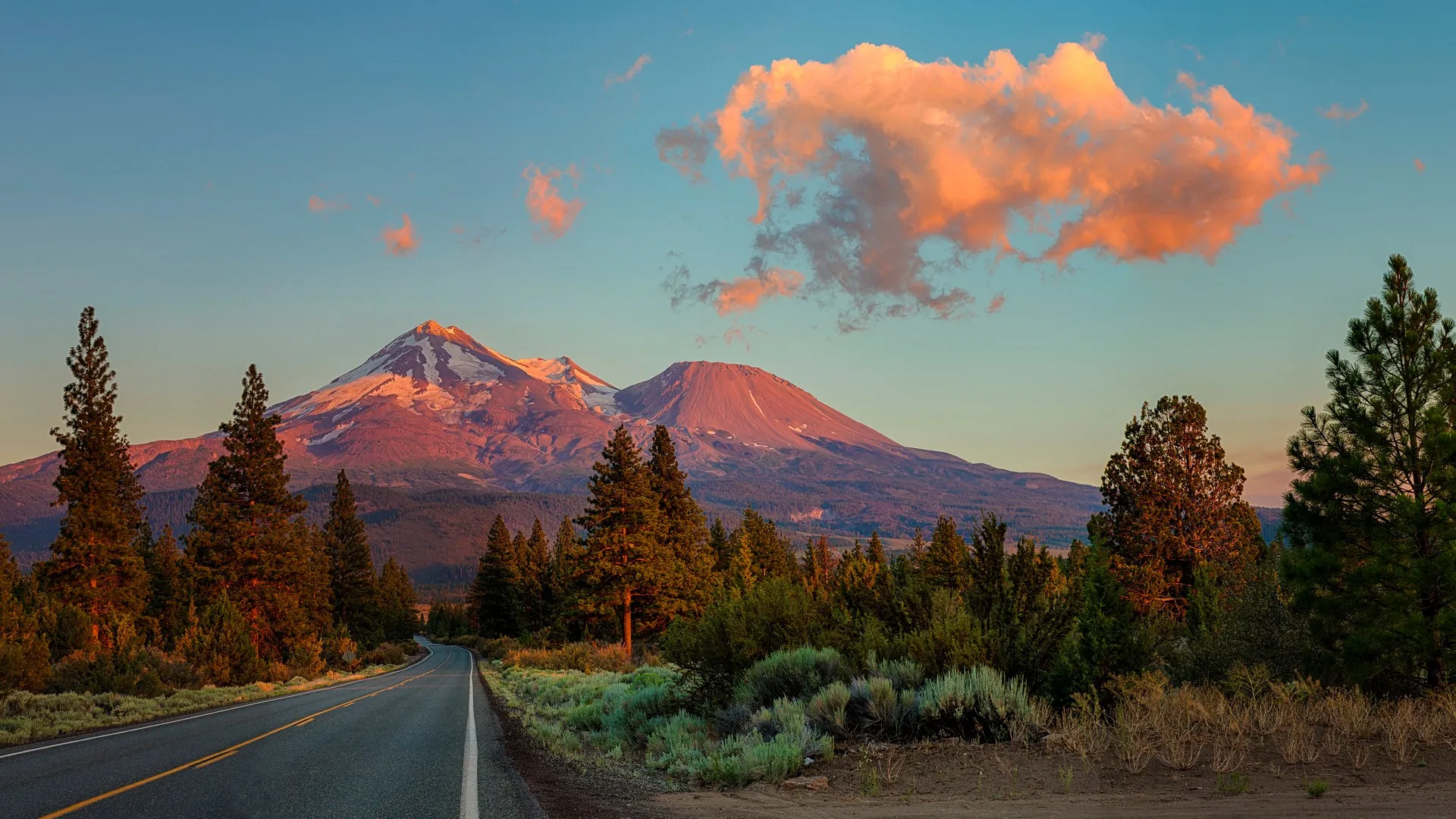 山沙斯塔 加利福尼亚州 摄影 景观 日落 松树 云 晚霞 山 雪峰 阳光 雪 天空 道路 树木