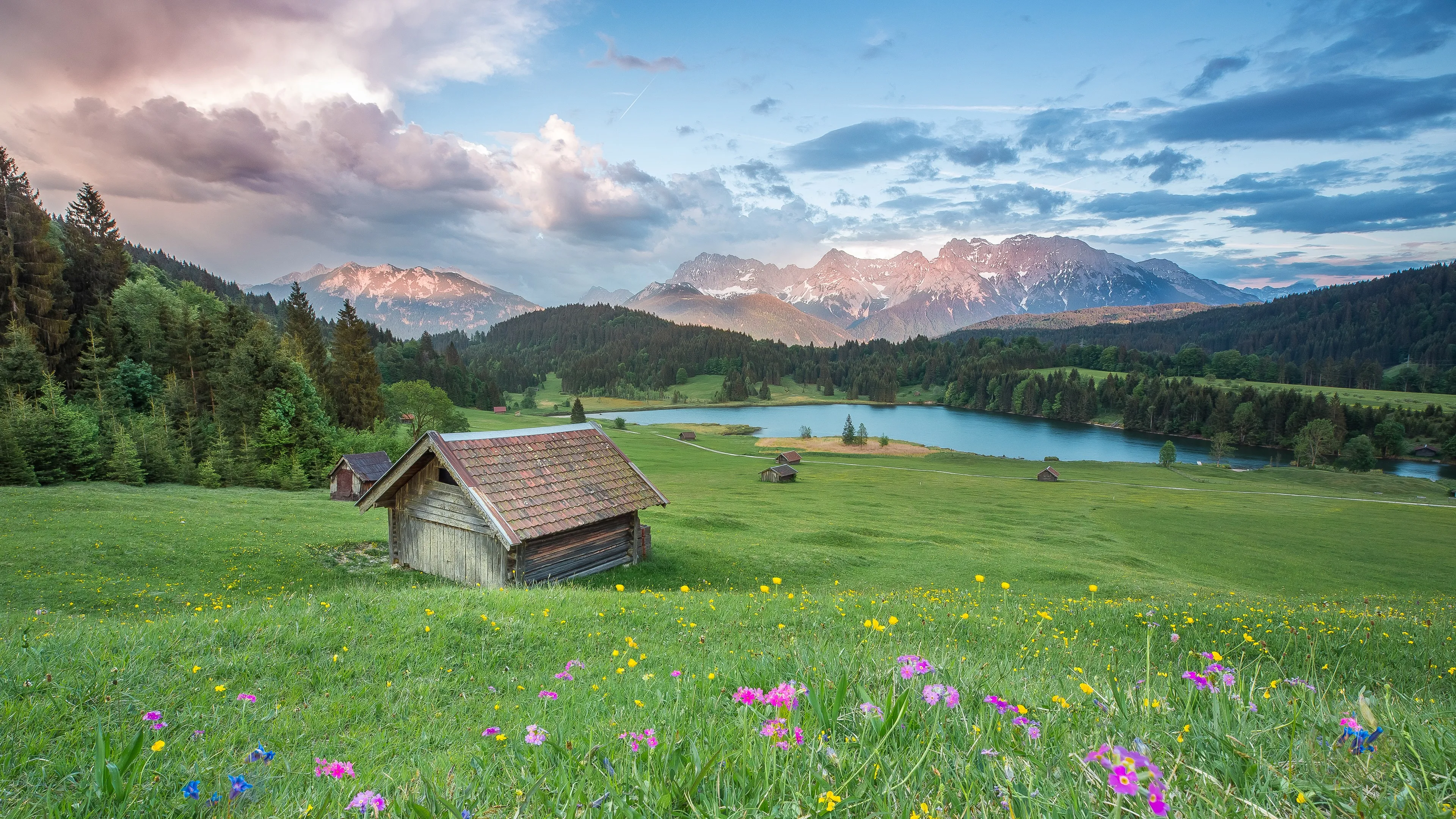 山脉 风景 4k 高清 湖泊 水面 草地 房子 小屋 治愈 温馨 4K壁纸