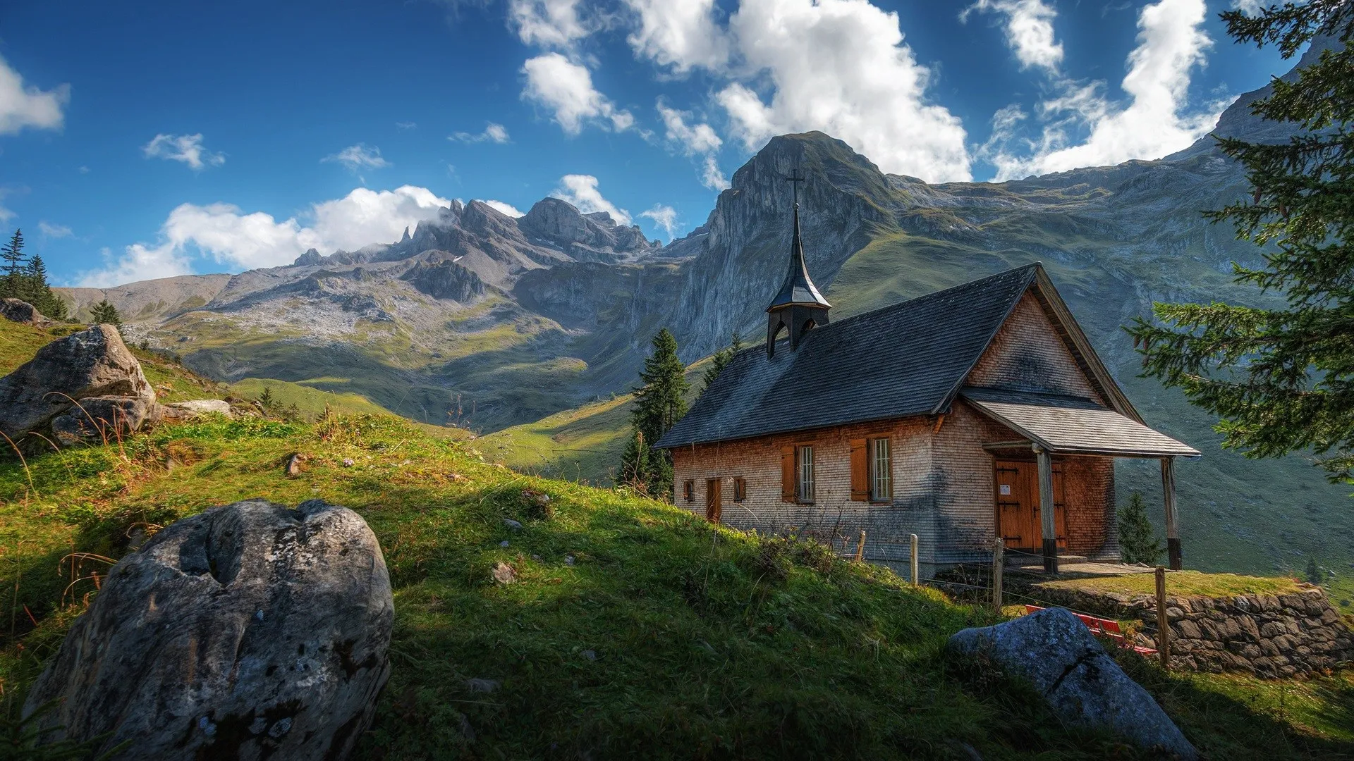 风景 自然 瑞士 山脉 天空 云 房屋 草地 阴影