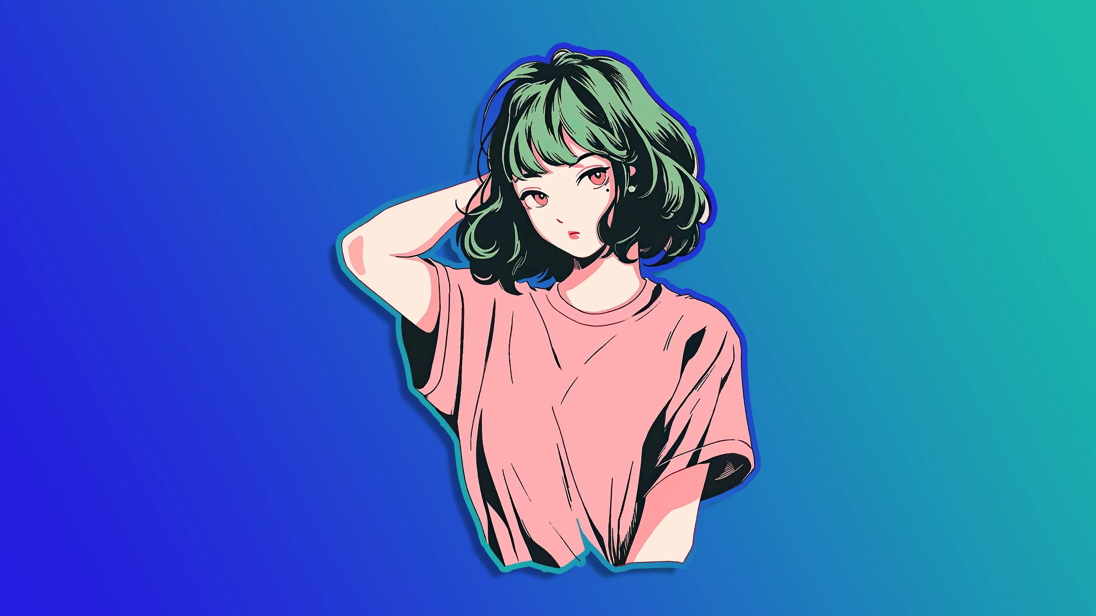 绿头发 动漫 女孩 渐变 蓝色背景 放大 4K壁纸