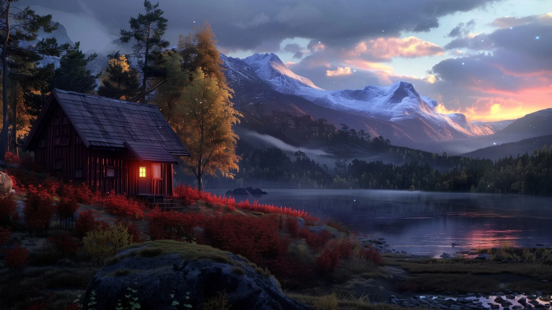 创意独特美4K插图风景小屋 山 湖 电脑壁纸