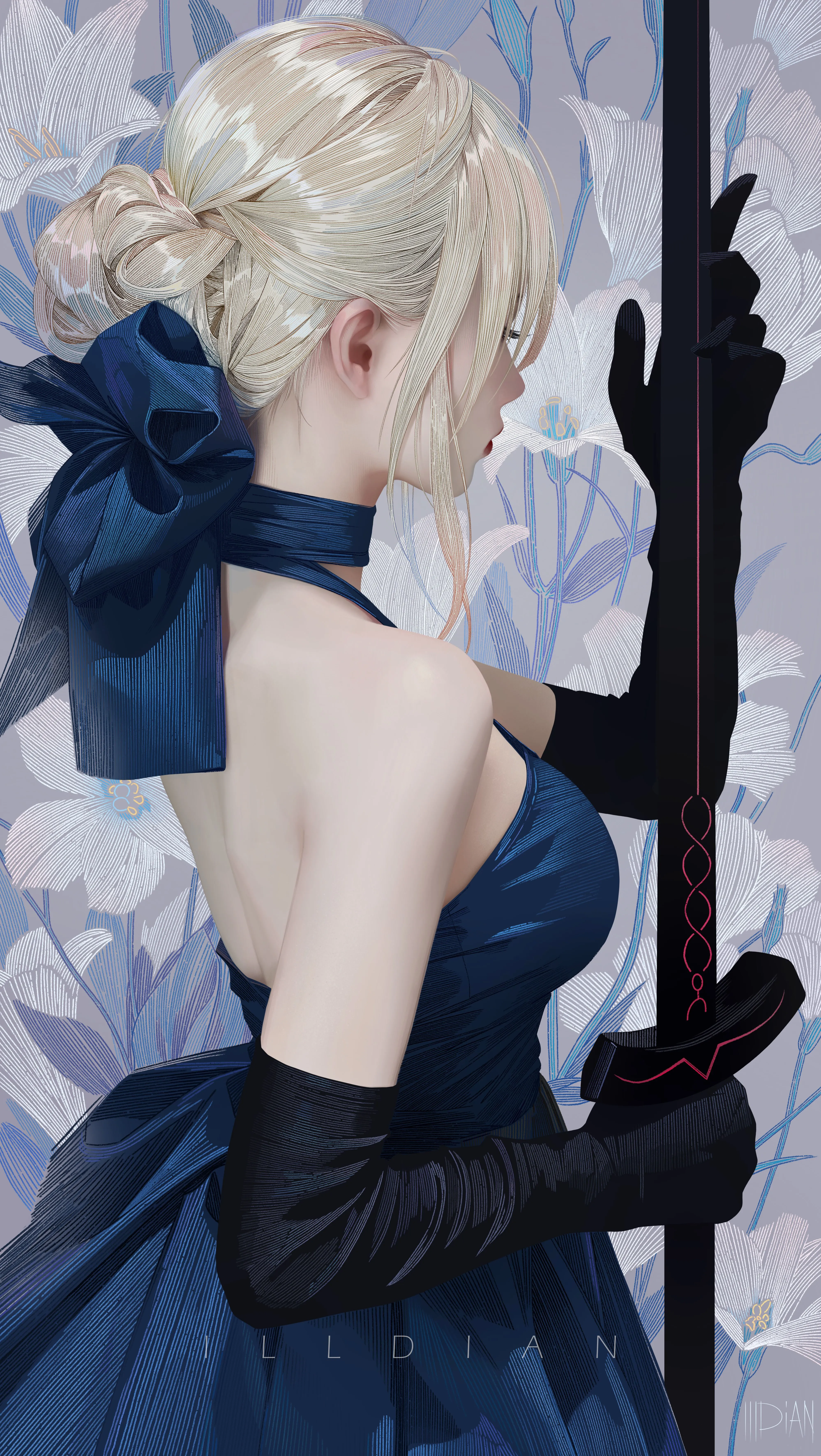 长发 金发 剑 背部 插图 绘画 肖像 连衣裙 鲜花 命运 手机壁纸 4K壁纸