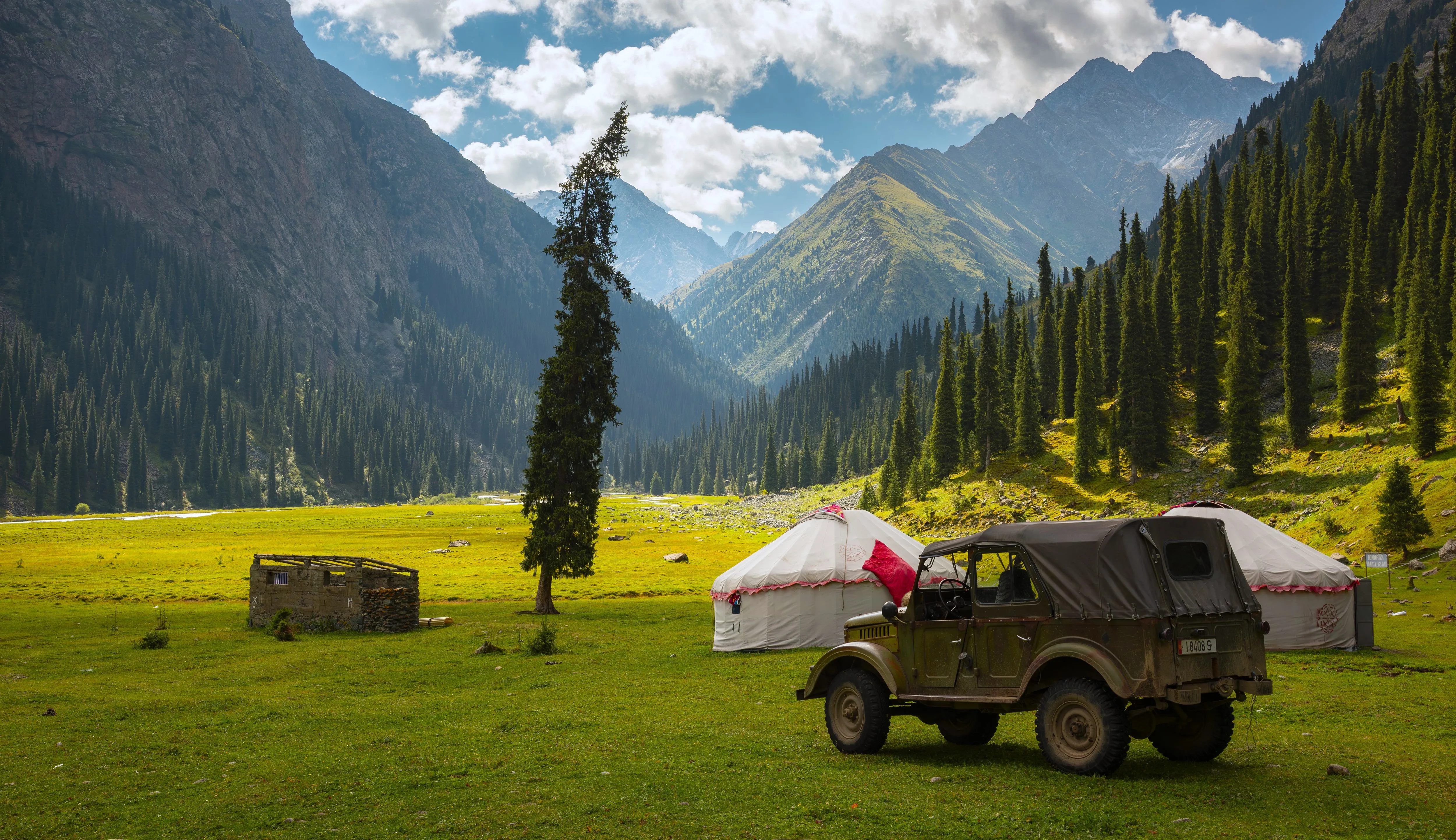 自然 景观 树木 草 帐篷 山脉 天空 云 岩石 山谷 吉普车 4K壁纸