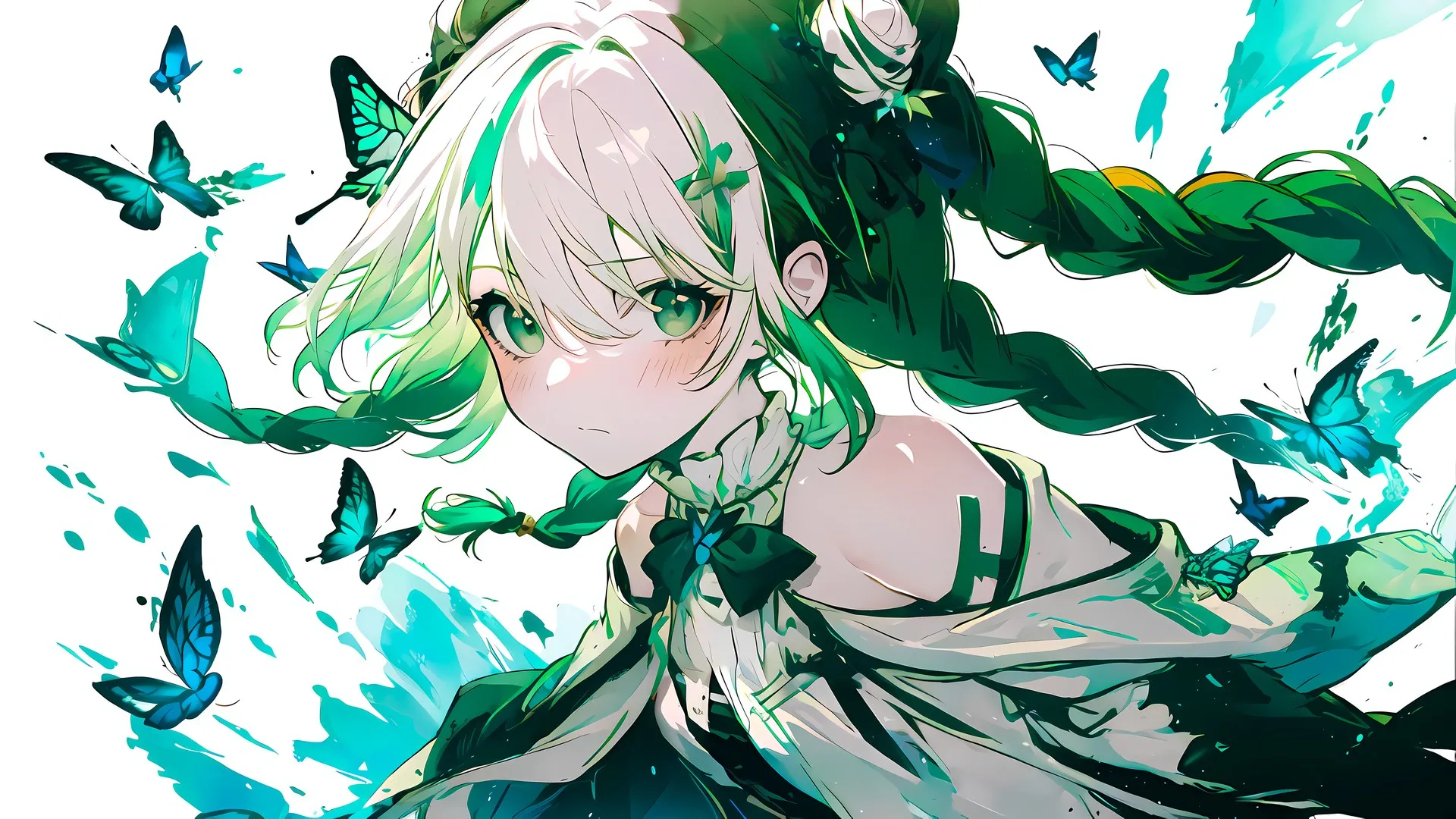 渐变头发 辫子 绿色眼睛 人工智能艺术 蝴蝶 动漫女孩