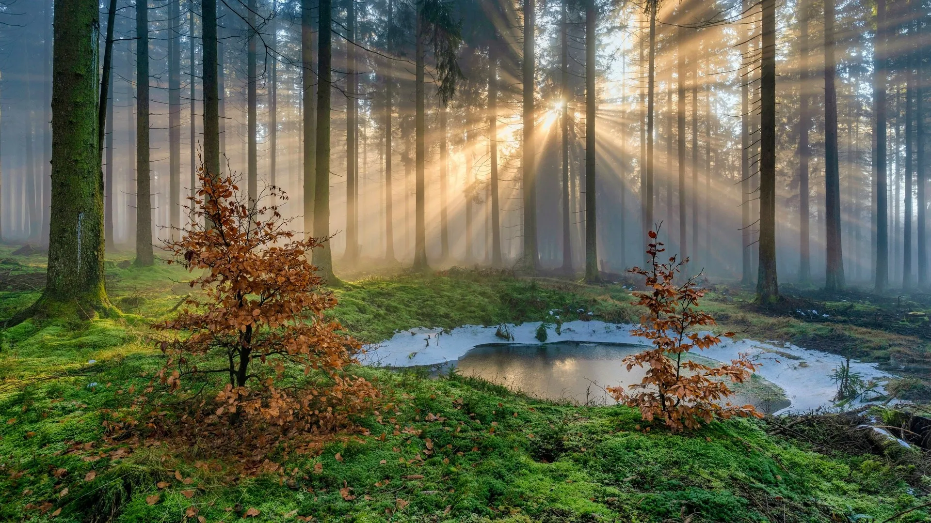 自然 森林 树木 树叶 苔藓 雪 湖 阳光 薄雾 水 电脑壁纸 4K壁纸