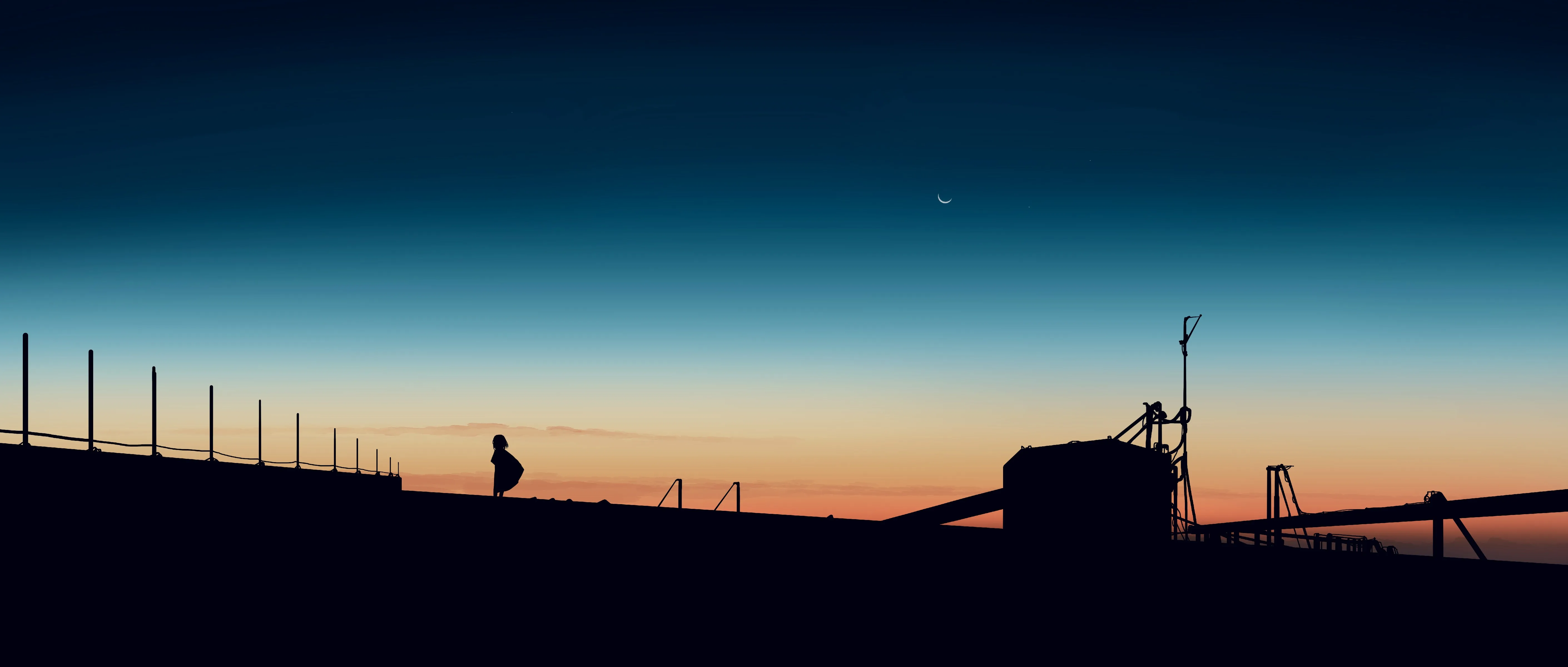优雅 动漫女孩 日落 月亮 夕阳辉光 天空 新月  电脑壁纸 4K壁纸