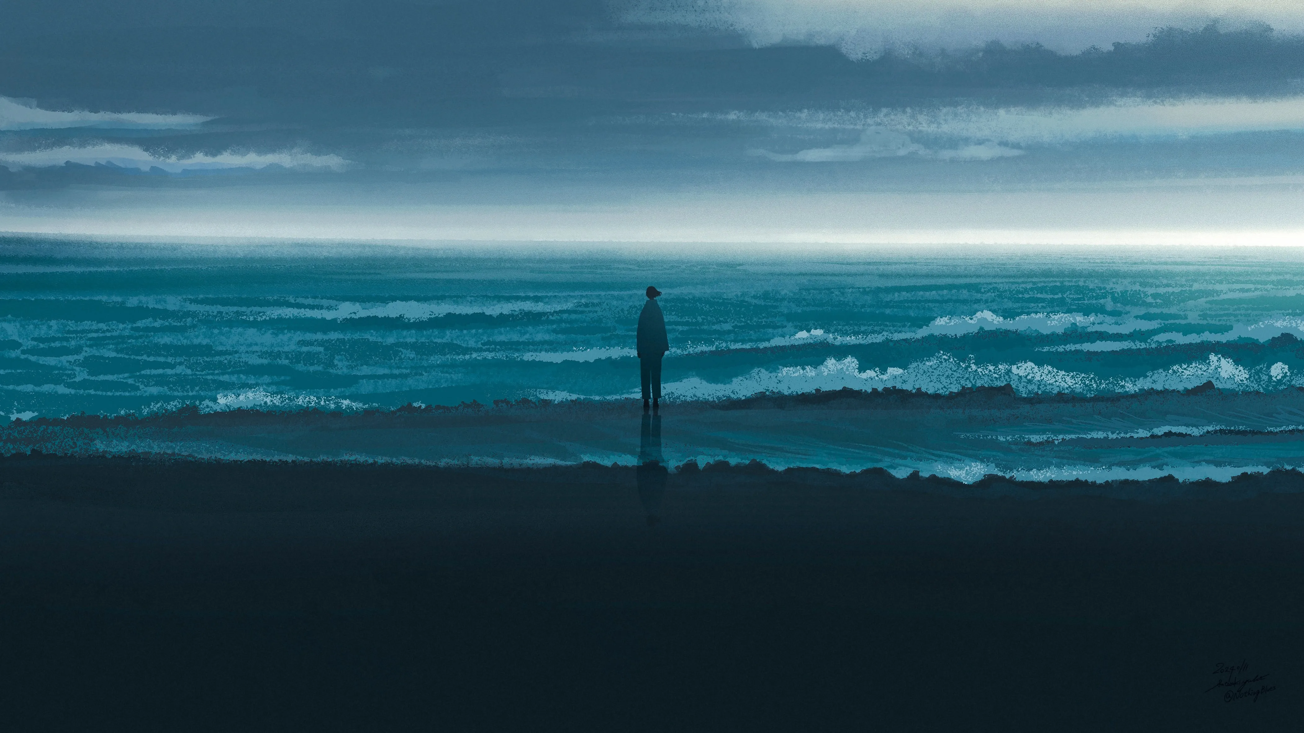 站立 头发 艺术品 数字艺术 数字绘画 动漫 海滩 阴影 波浪 云 孤独   电脑壁纸 4K壁纸