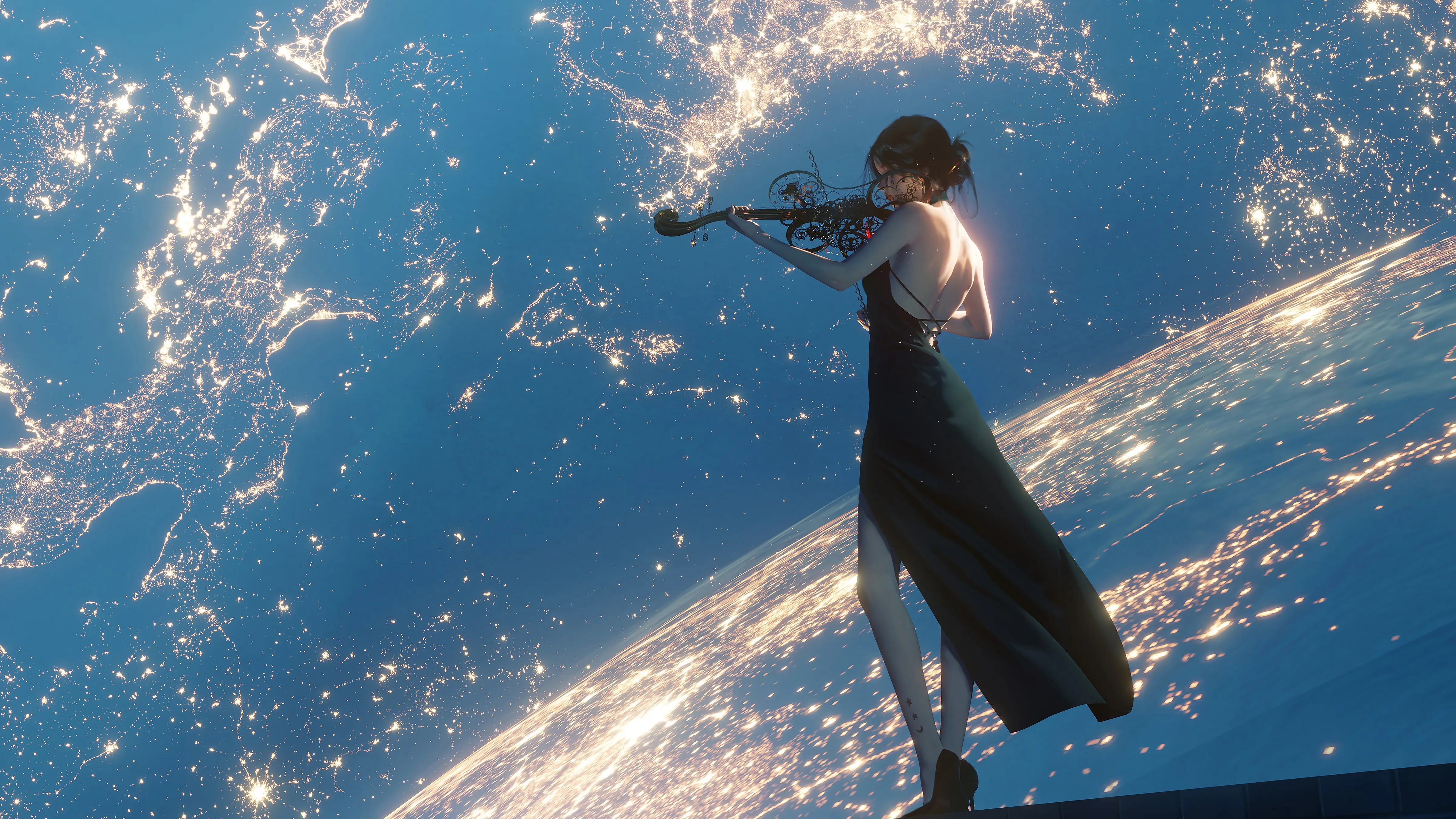 WLOP 动漫 女孩 星光 礼服 小提琴 黑色礼服 唯美 治愈 高档 艺术 4K壁纸