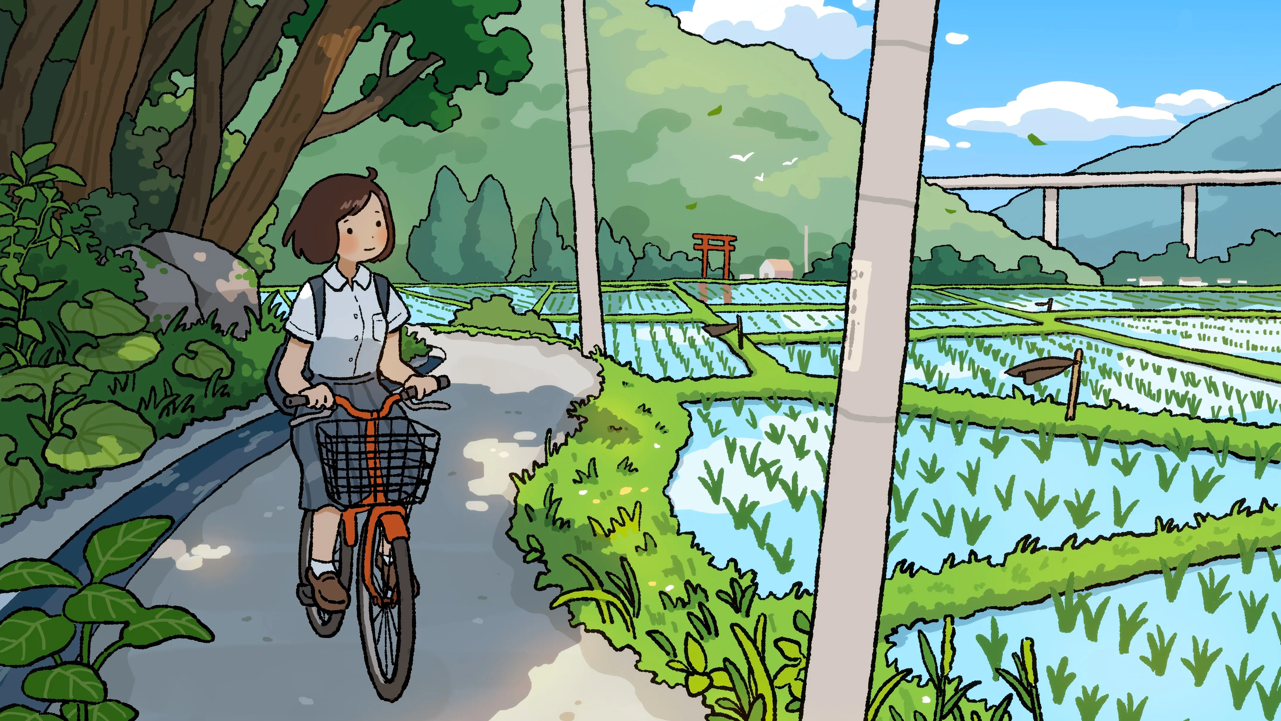 黑发 丸野 风景 动漫 女孩 自行车 稻田 道路 草地 自然 乡村 鸟居 户外 4K壁纸