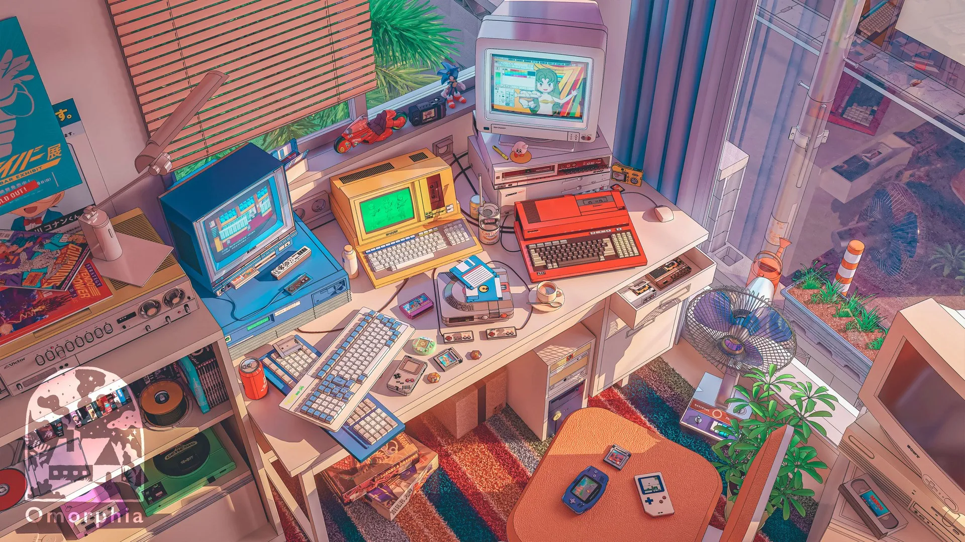 插图 彩色 绘画 复古 室内 计算机 桌子 风扇 房间 椅子 键盘 阳光 百叶窗 杯子 盘子 勺子 叶子 地毯 卡带 相机 电脑 鼠标 窗户 4K壁纸