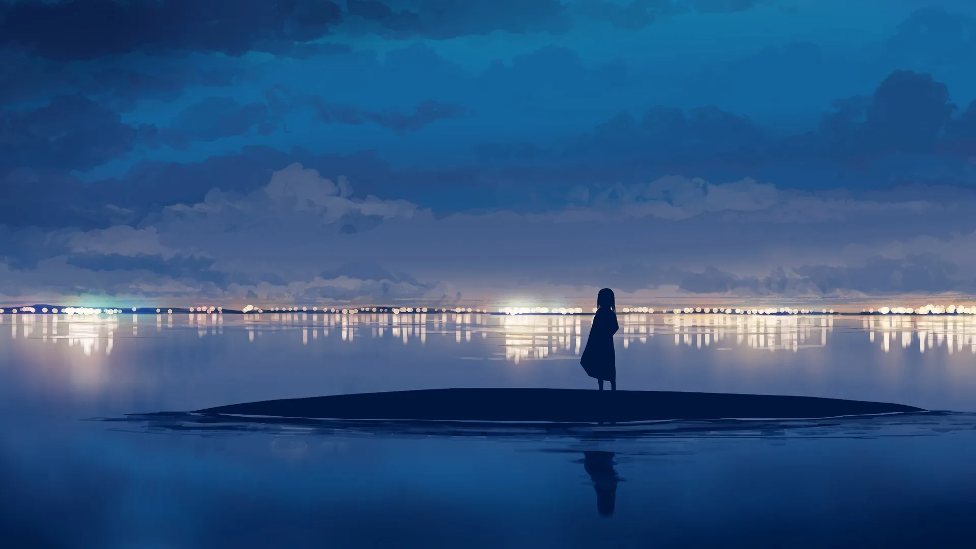 优雅 动漫 动漫女孩 地平线 云 天空 剪影 河边 反射 灯光 水