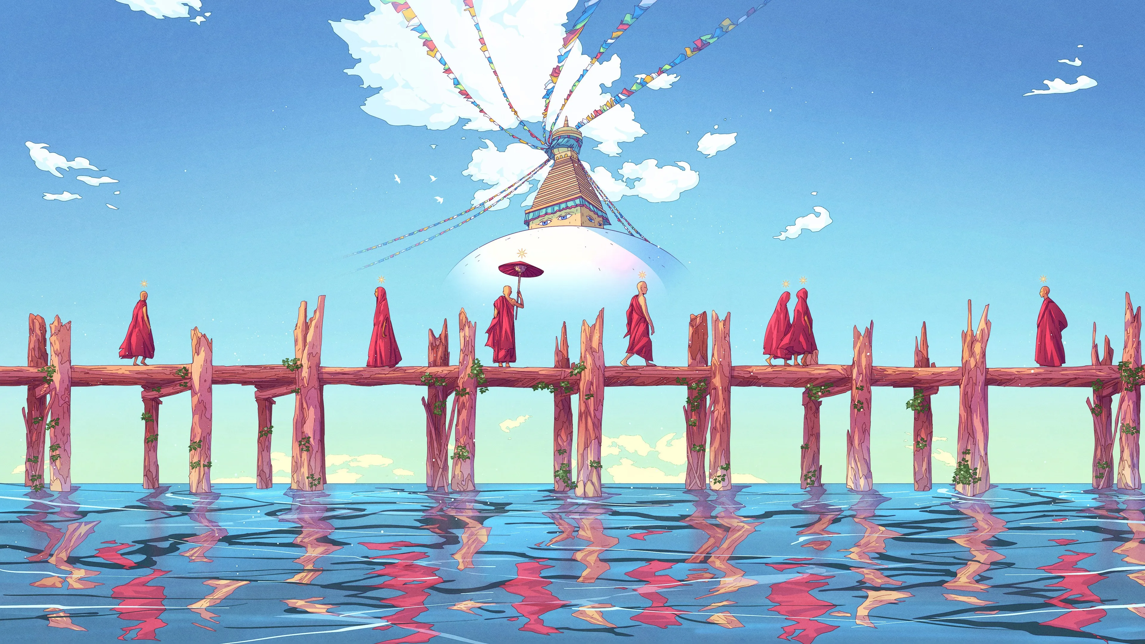 眼睛 僧侣  AI艺术 奇幻艺术 桥梁 河流 倒影 云 水 天空 伞  电脑壁纸 4K壁纸