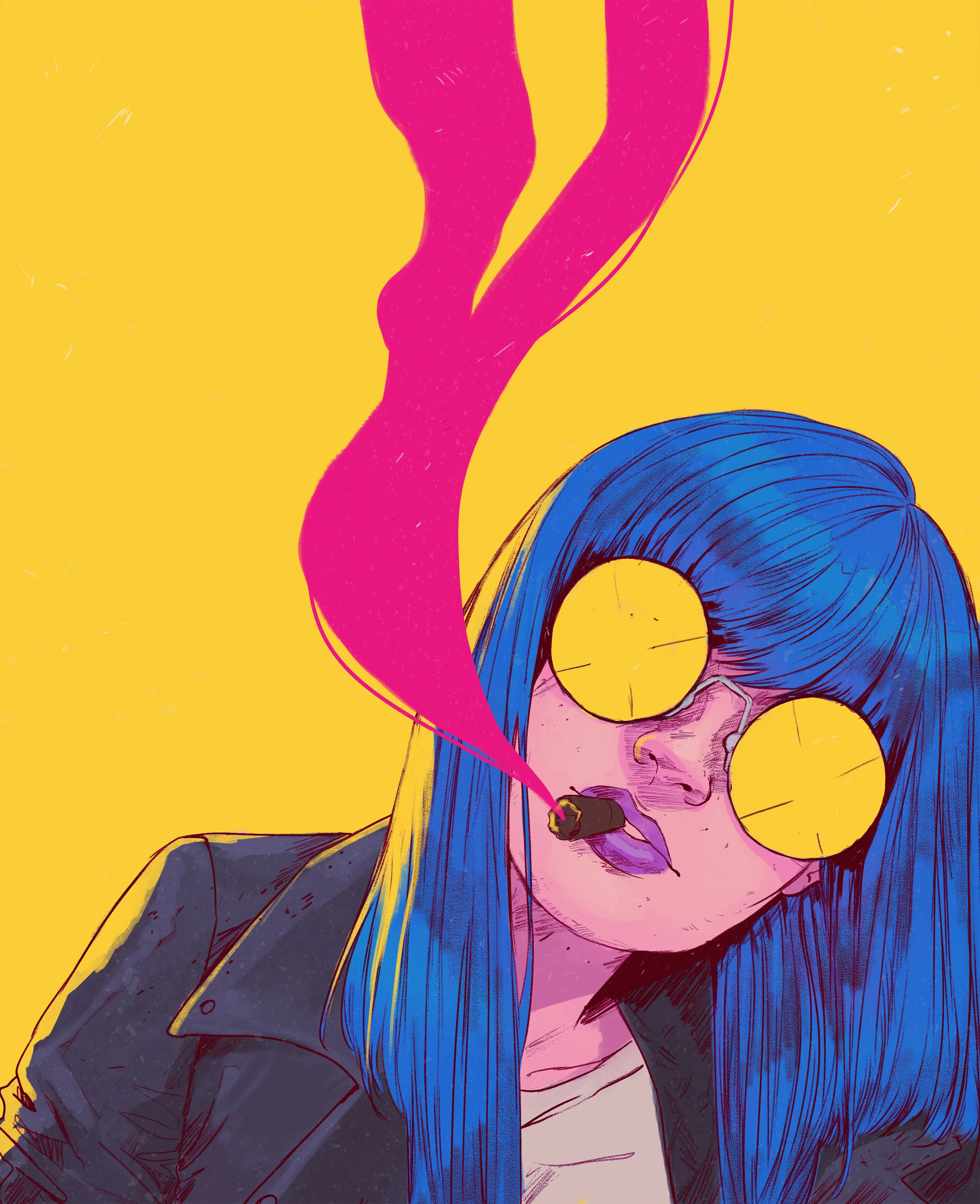 女人 蓝色头发 简单背景 黄色背景 绘画 插图 太阳镜 极简主义 手机壁纸 4K壁纸