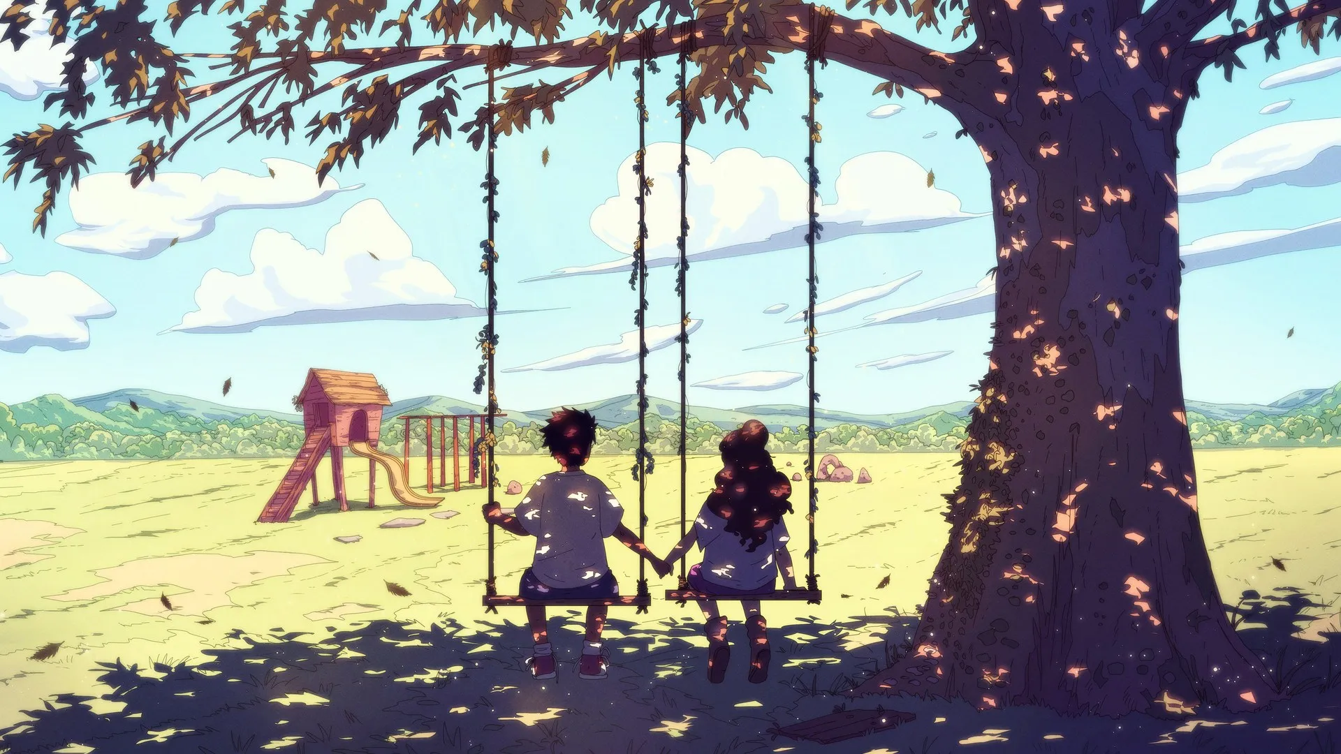 儿童 手牵手  AI艺术 奇幻艺术 秋千 树木 云 自然  电脑壁纸 4K壁纸