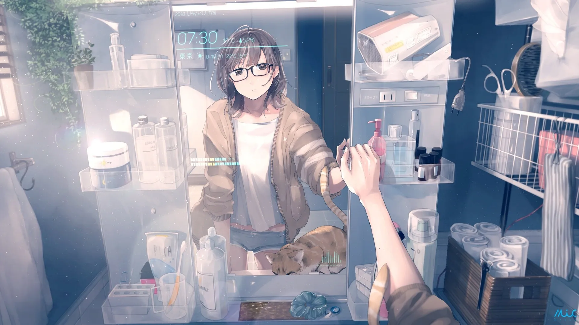站立 前田麦克风 动漫 动漫女孩 镜子 倒影 猫 室内  电脑壁纸 4K壁纸