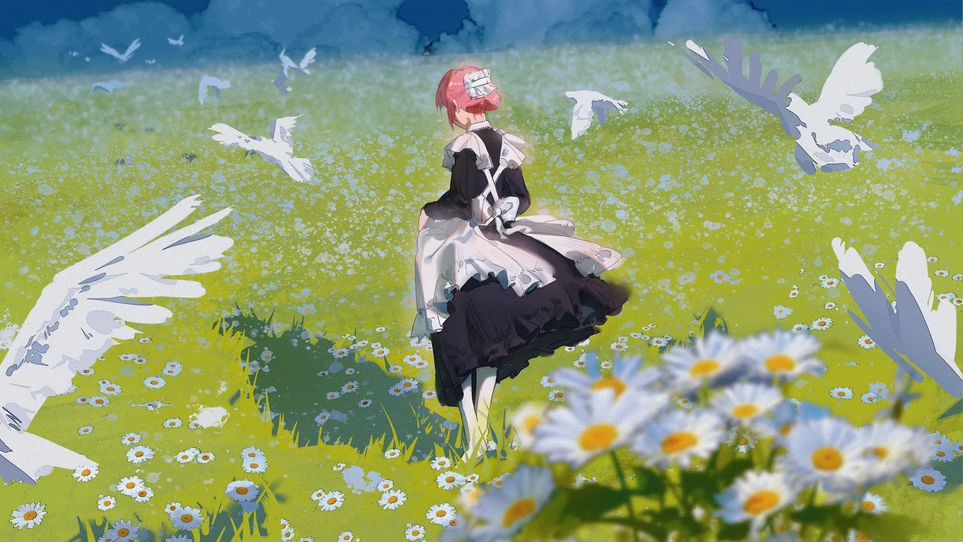动漫 动漫女孩 女仆装 鸟 花 女仆 草 领域 围裙  电脑壁纸 4K壁纸