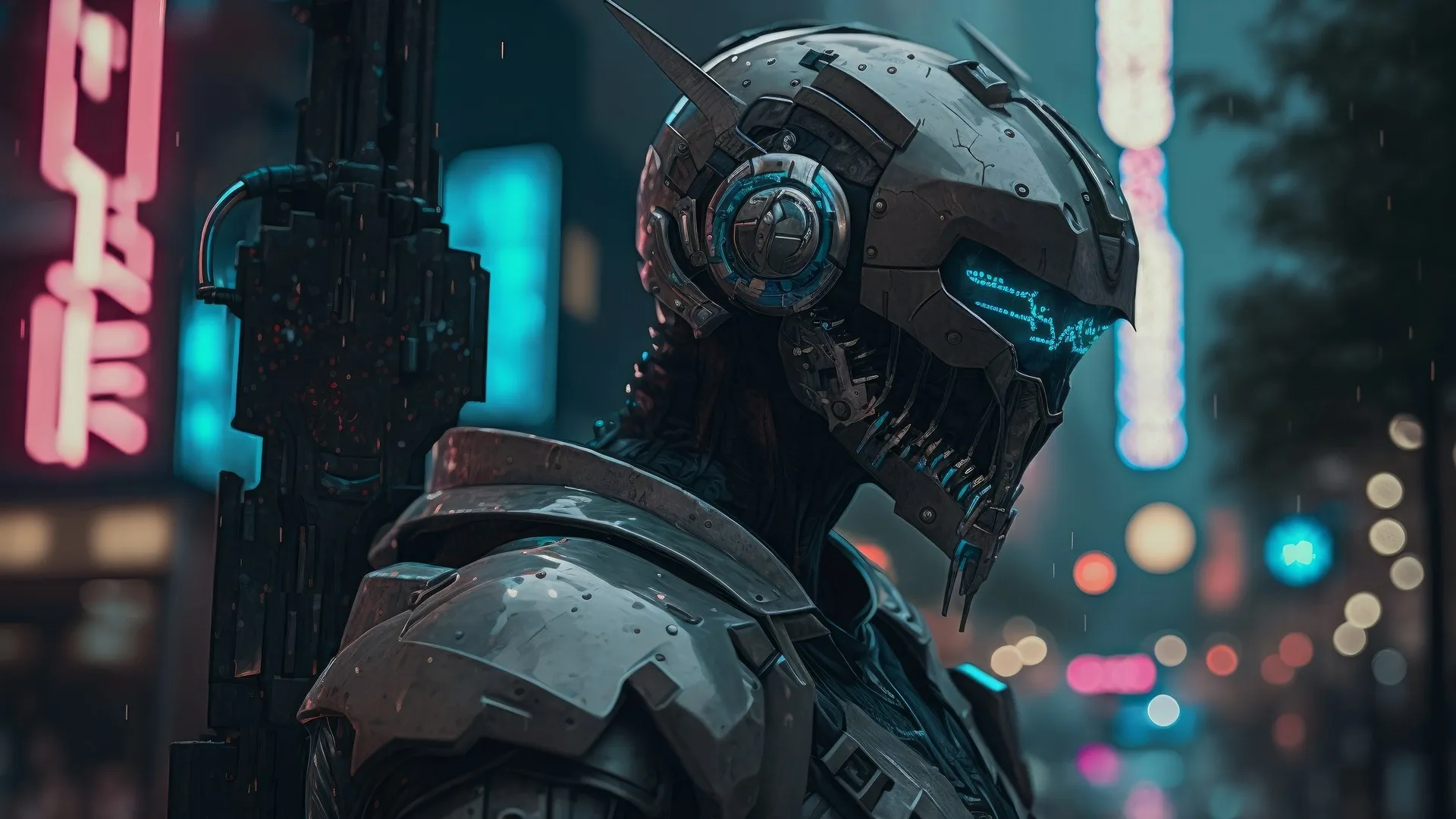 艺术 城市 夜晚 城市灯光 霓虹灯 赛博朋克 头盔 科幻小说 未来主义  电脑壁纸 4K壁纸