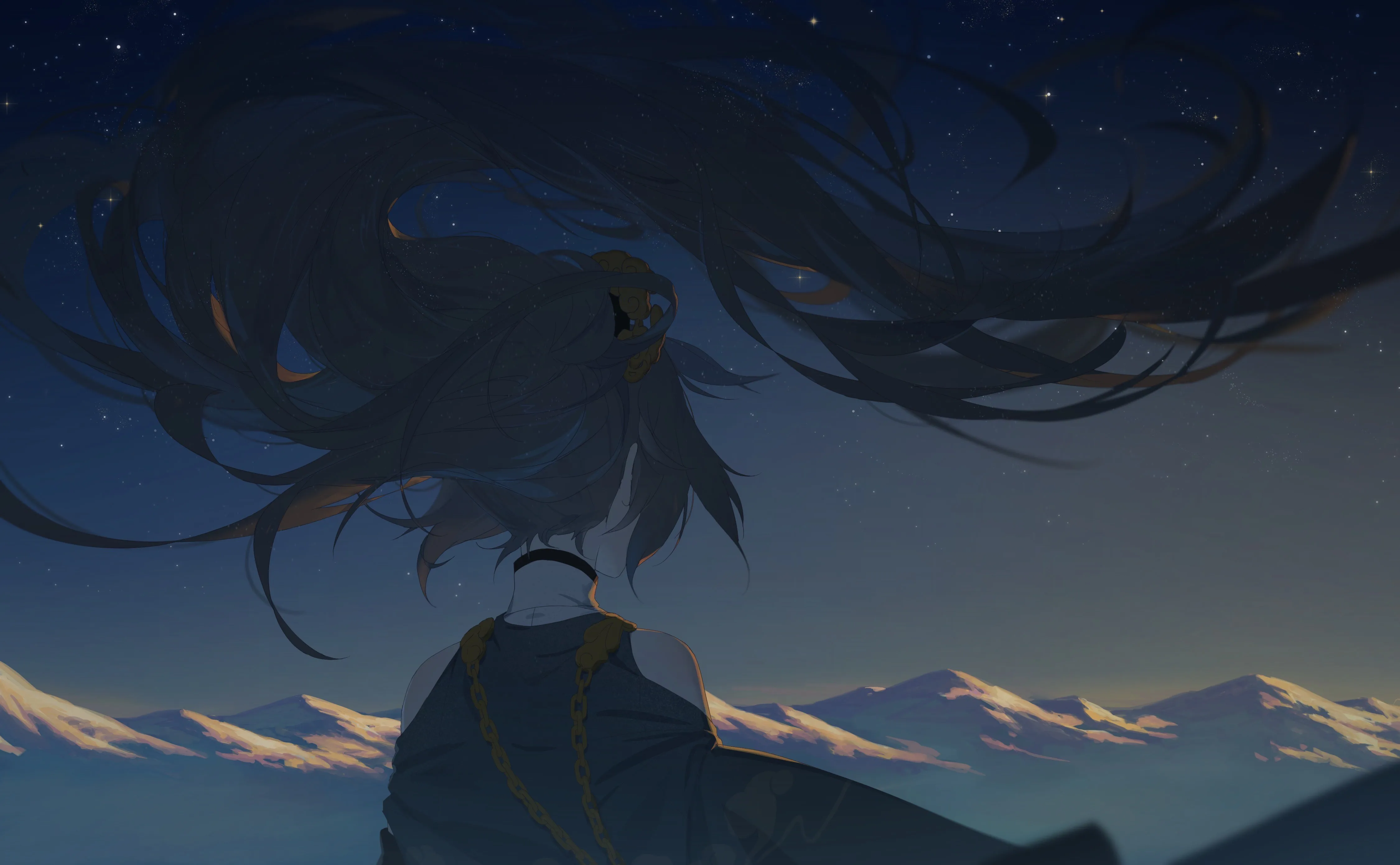 长发 动漫 女孩 山 星星 日落 4K壁纸